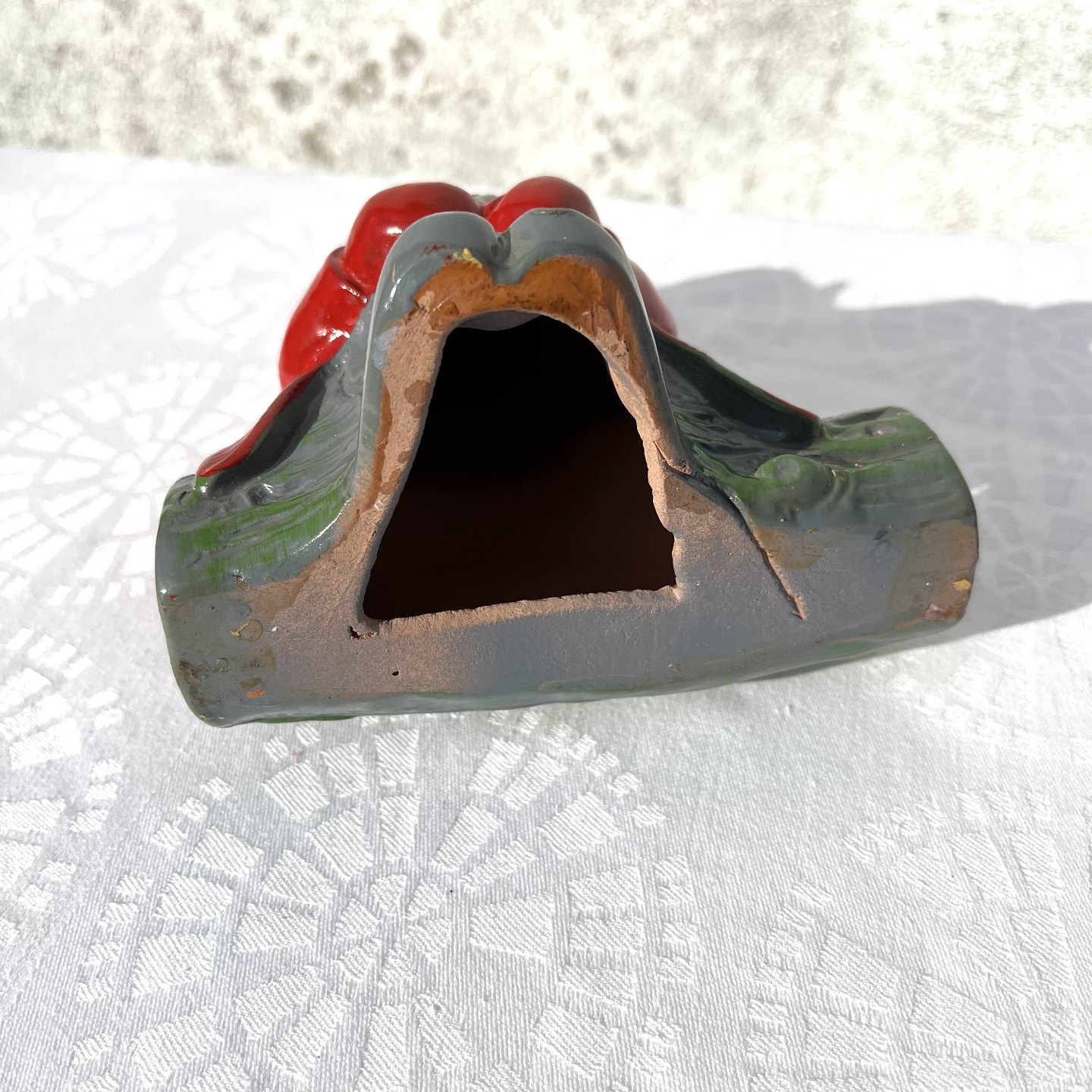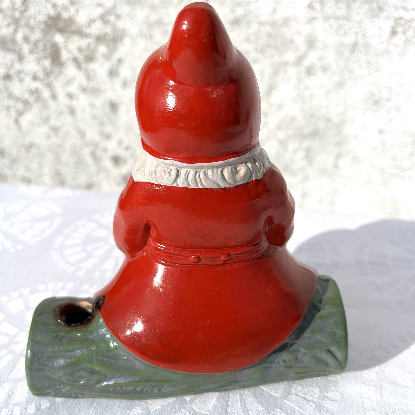 Ler nisse på stub og lysestage, 12cm bred, 14cm høj *Med lidt sod på siden*