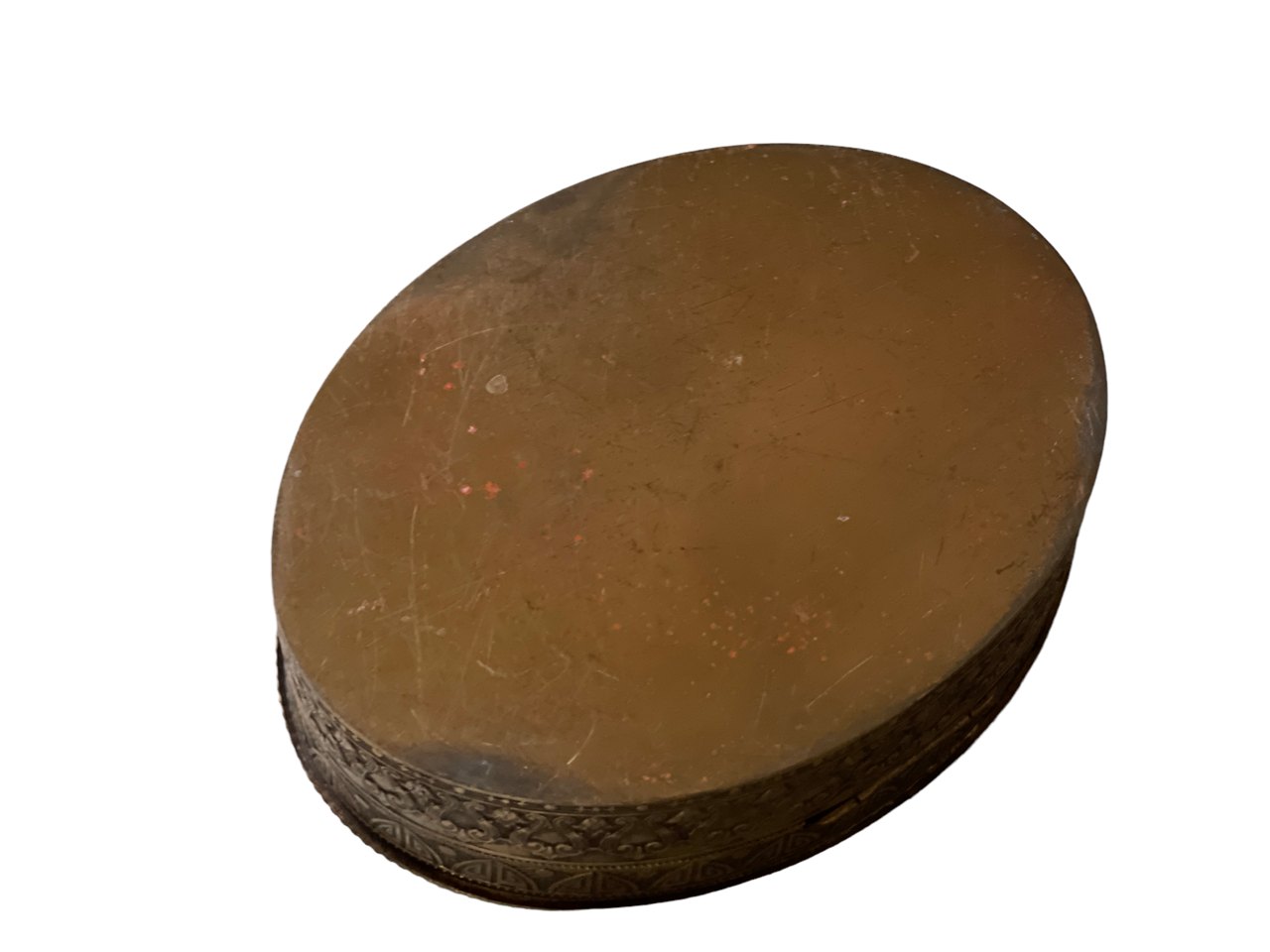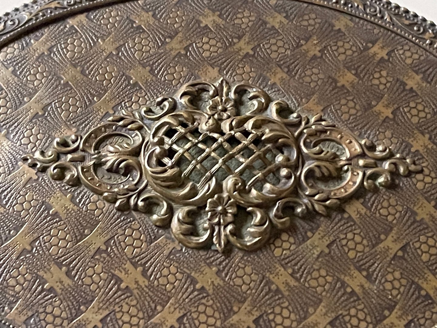 Antikt, fransk smykkeskrin af bronze med rokoko rocaille mønster på toppen.