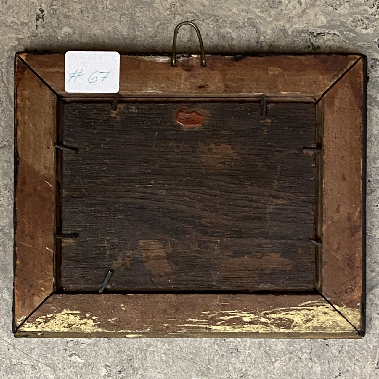 1700tals miniature maleri af ukendt kunstner malet på træplade i original ramme. Forestillende vinterlandskab med"borgfrue" på spadseretur i rød robe, fulgt af kavalerer. Fine detaljer.