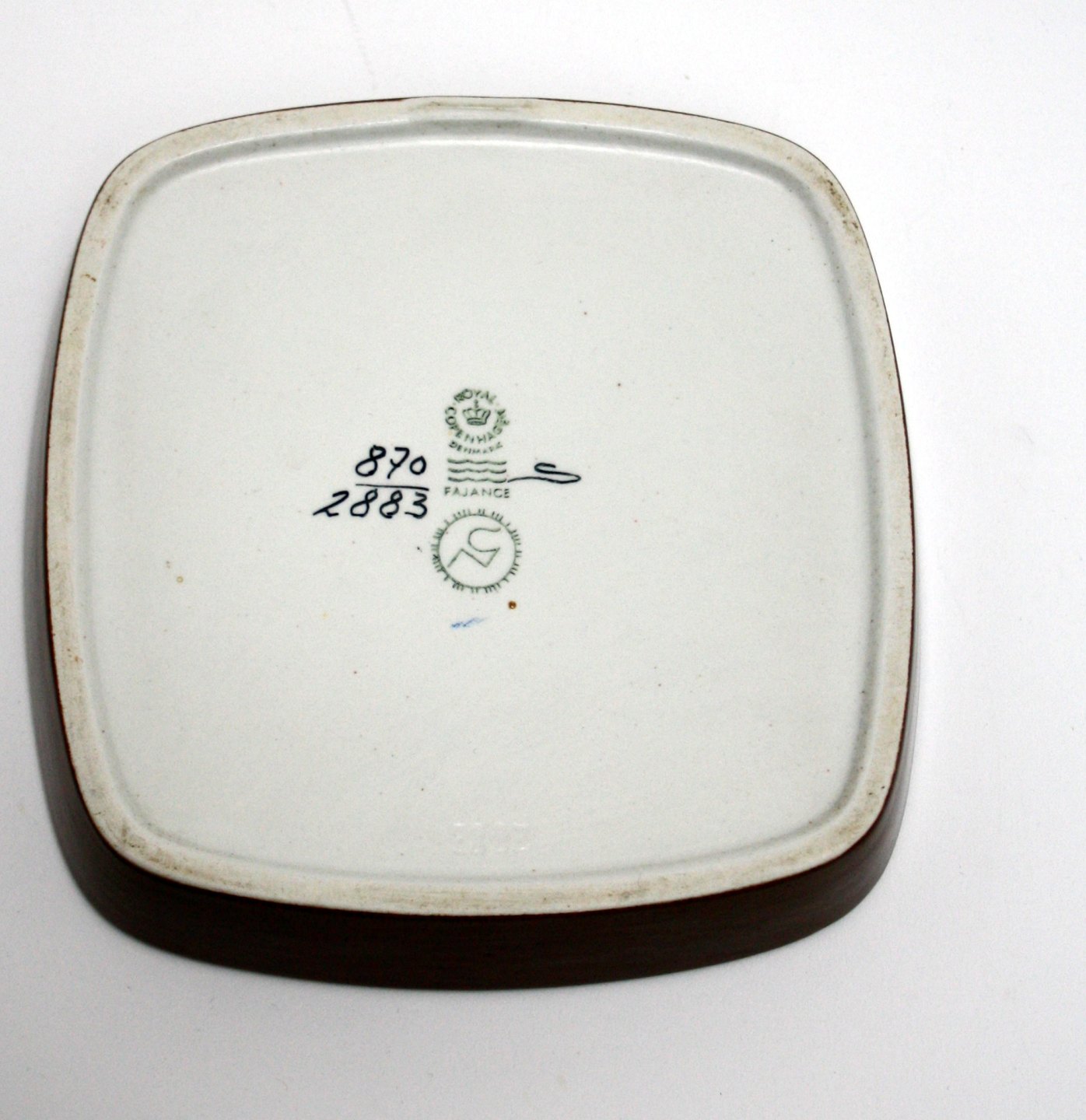 Royal Copenhagen Fajance, Baca. Kunststengods, Firkantet mellem fad. Designet af Nils Thorson. Nr. 870/2883. Diameter 17x17 cm. Højde 3 cm. Pris: 285 kr. stk. Lager: 2