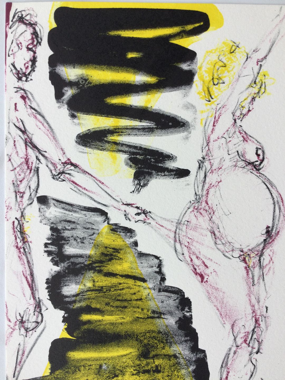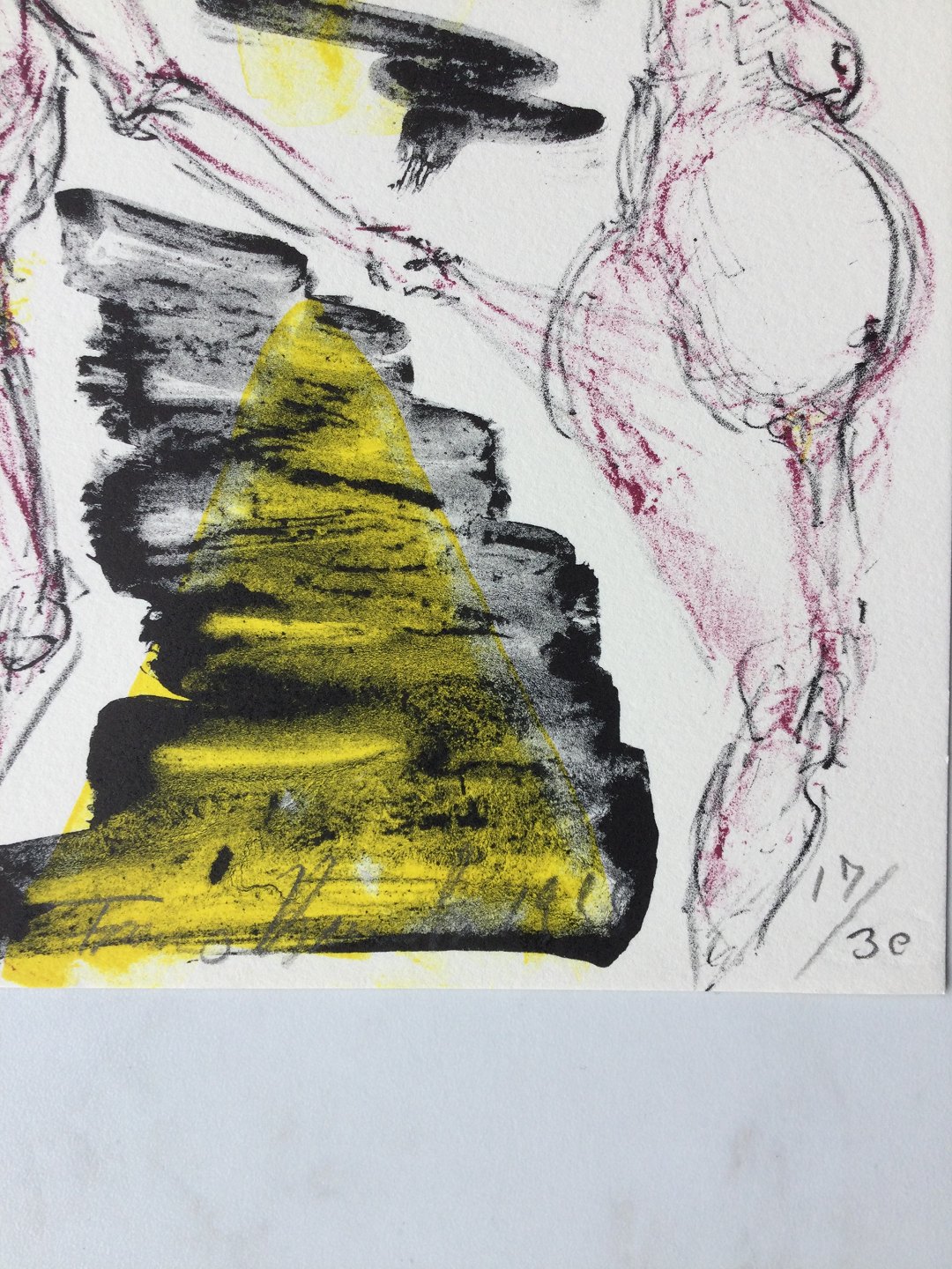 Farvelitografi af Frans Kannik 1998 - Erotisk komposition med gravid kvinde.