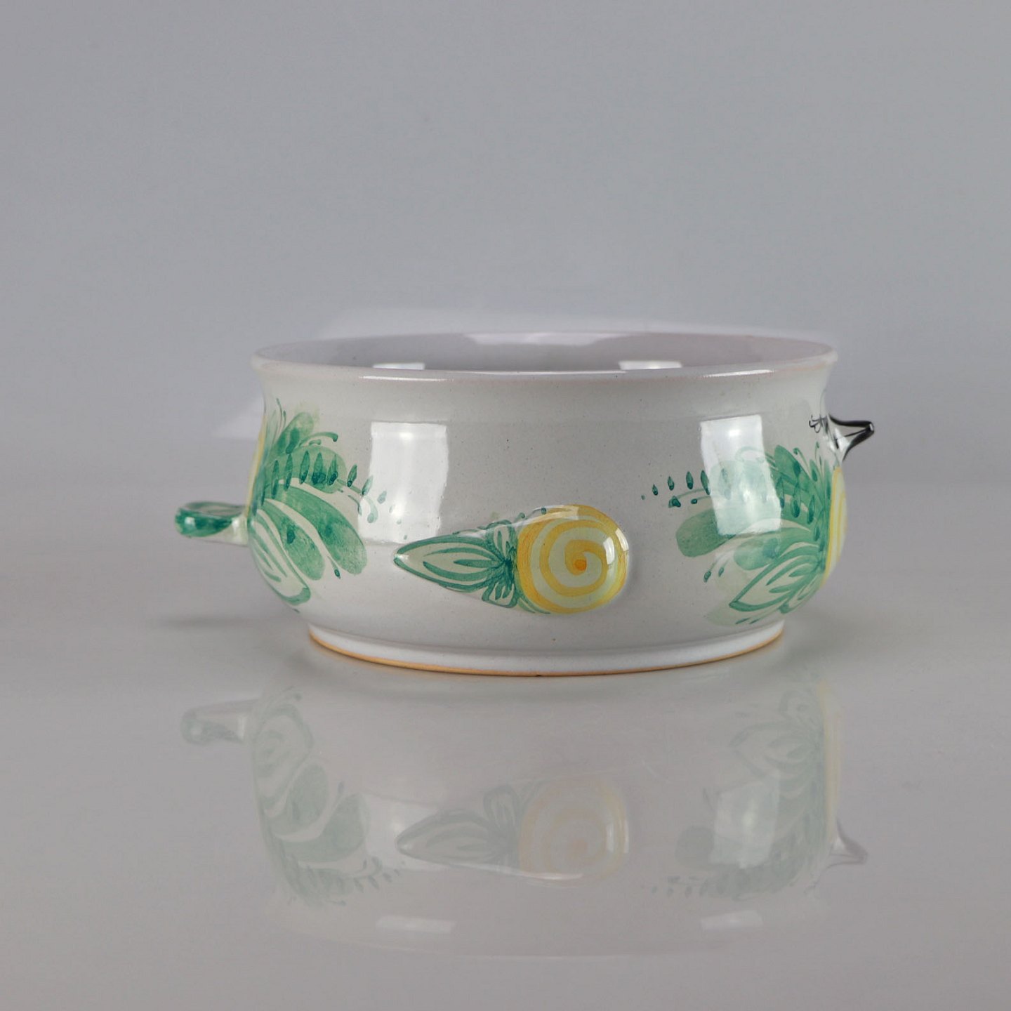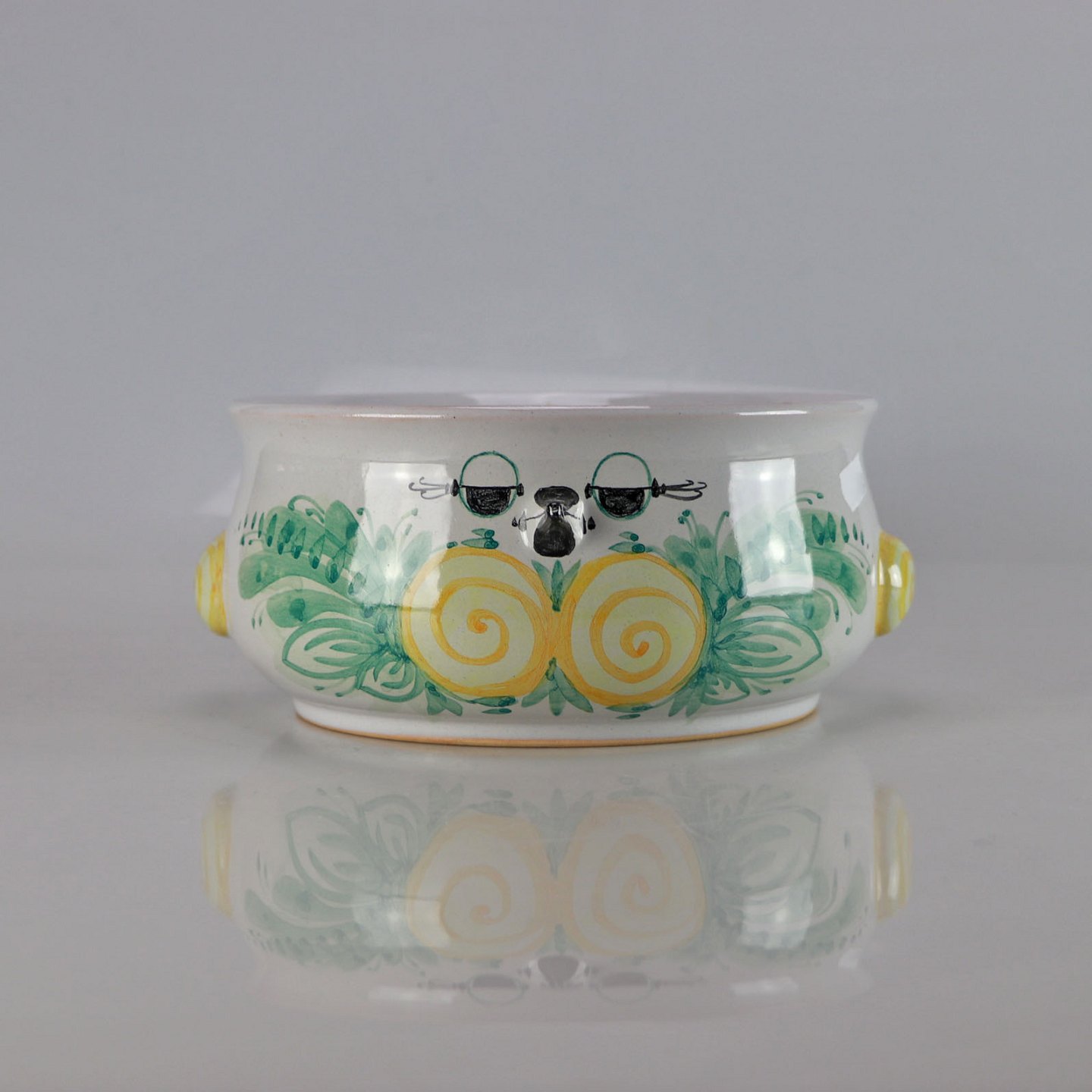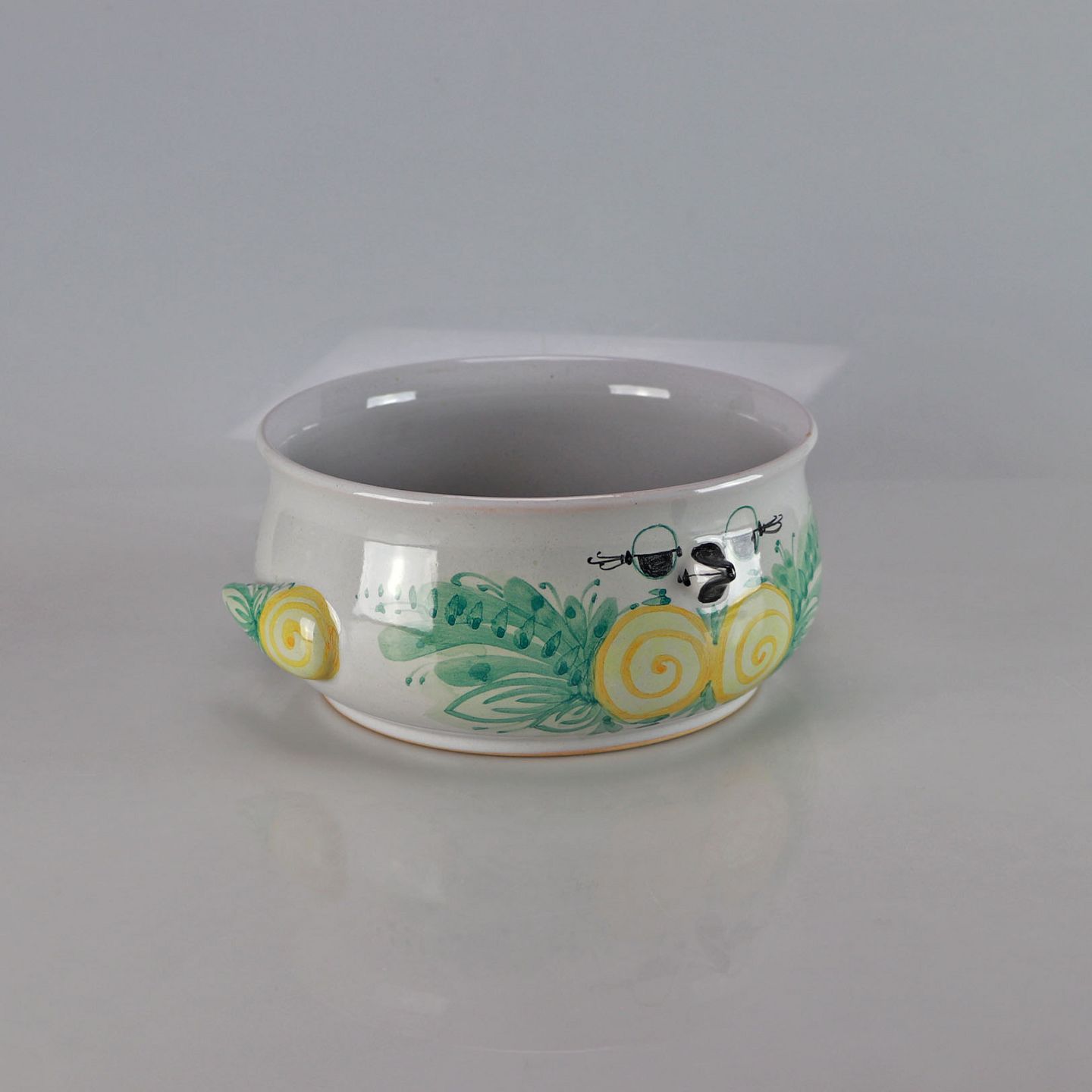 Farverig skål af Bjørn Wiinblad malet som fugl i grønne og gul farver.