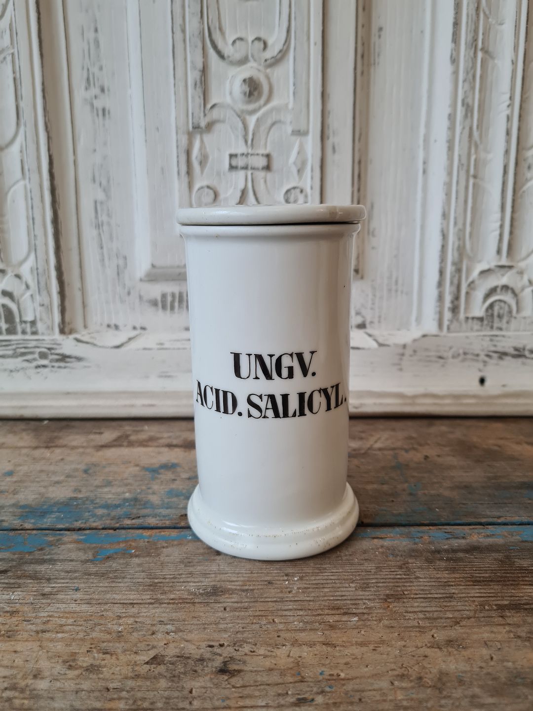 Royal Copenhagen Apotekerkrukke i hvidt porcelæn med sort skrift