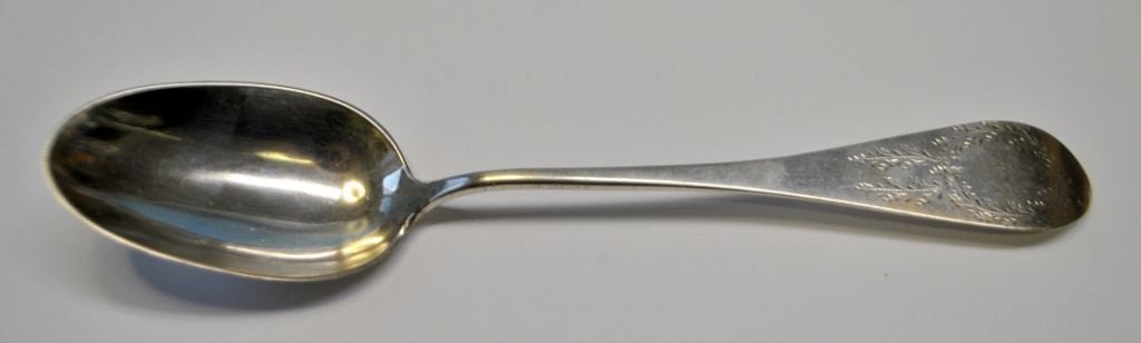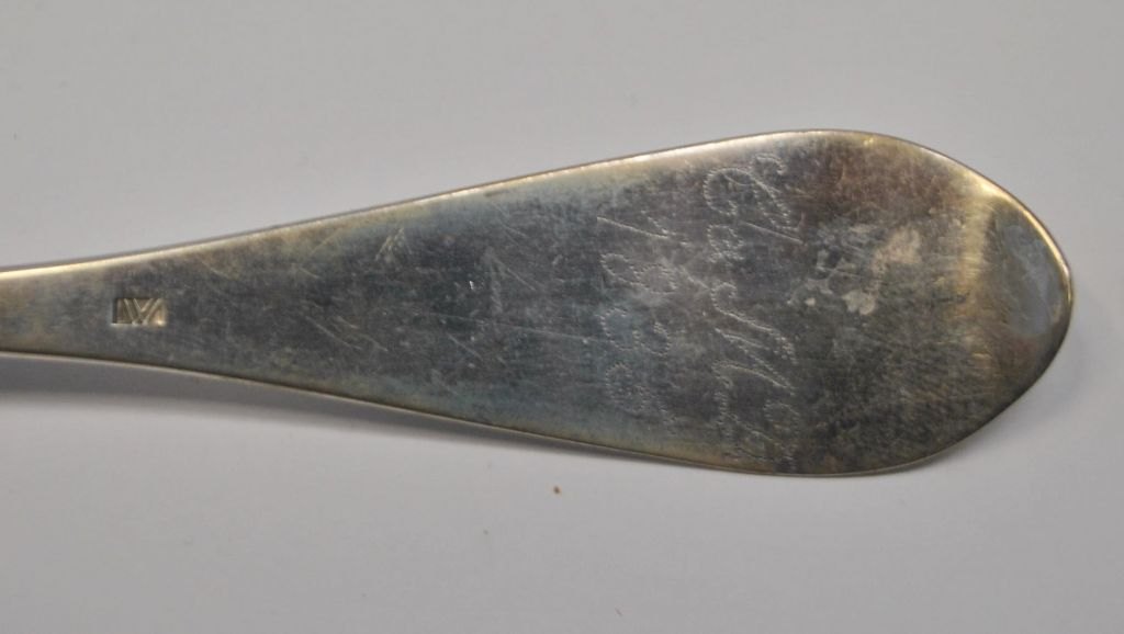 Sølv ske, 1835, Jens Weilgaard (1785 - 1863) Holstebro. Danmark. Med empire dekoration på skæft. Verso indgravering: Ca. M.D 1835. Længde.: 22 cm.