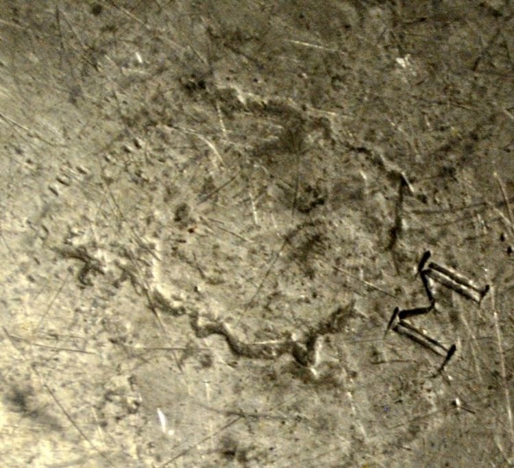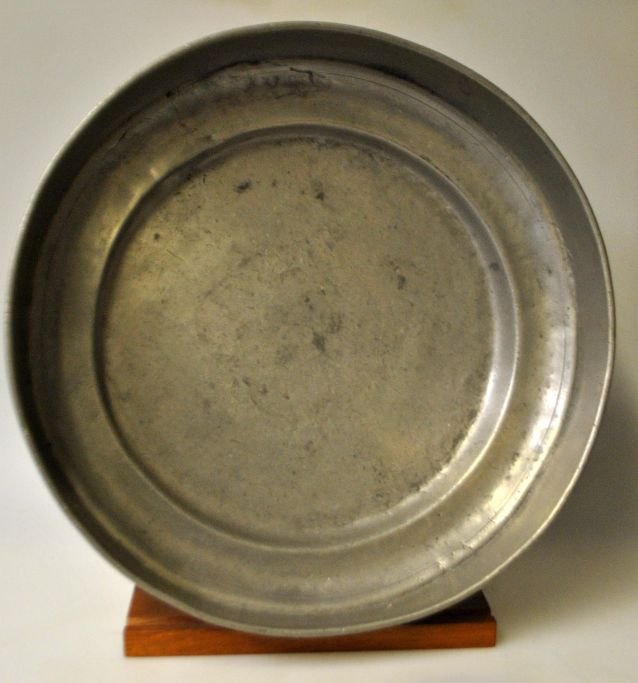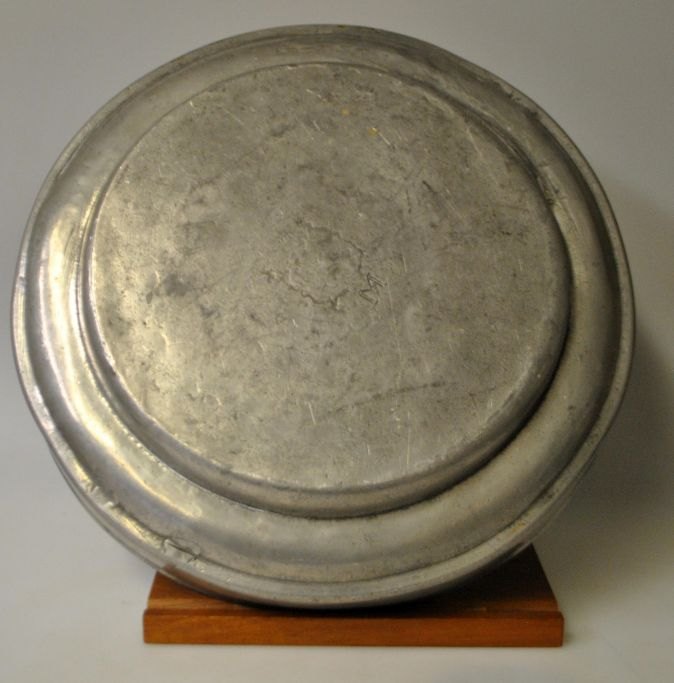 Large pewter dish on base, 18th century. Indistinctly stamped. Engraved: M. Height: 6 cm. Dia.: 29.5 cm.