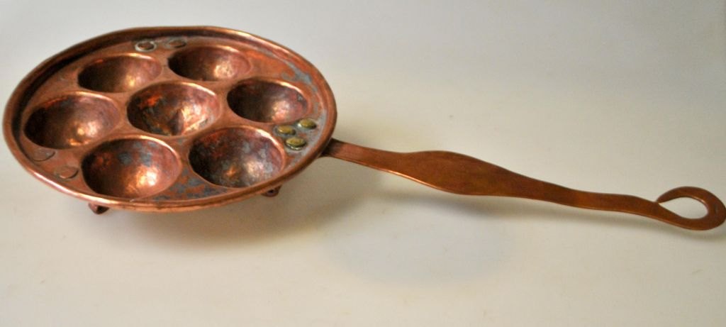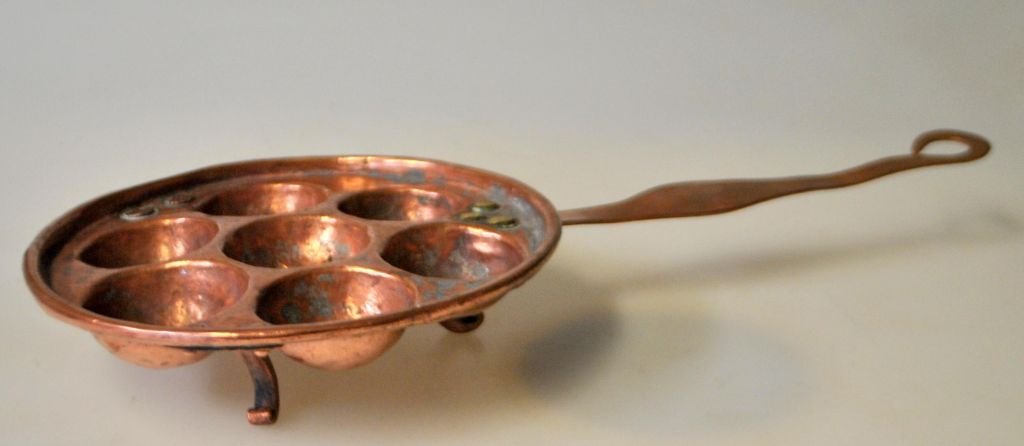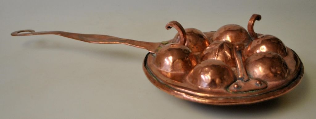 Barne kobber æbleskive pande, 19. årh. Danmark. Ustemplet. Rester af indvendig fortinning. Midterste hul er dekoreret med stjerne. På tre ben. Dia.: 14,5 cm. L.: 30,5 cm.
