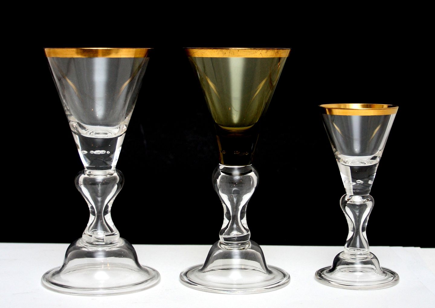 Barok glas med guldkant og balusterformet hul stilk. Rund klokkeformet bund med omslået rand.