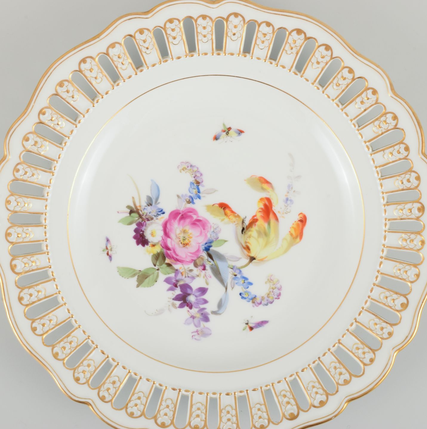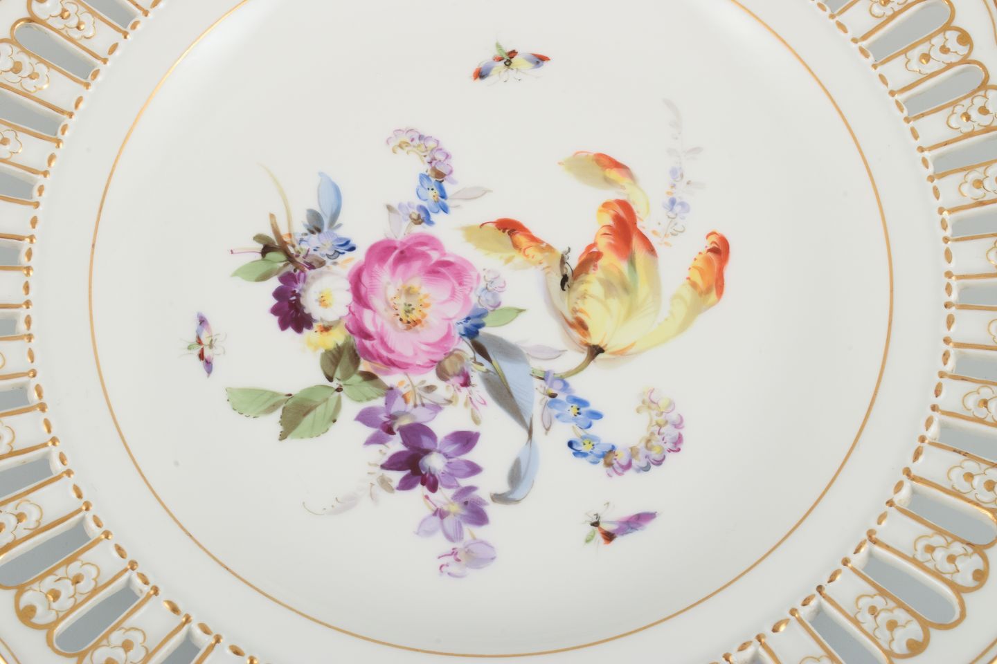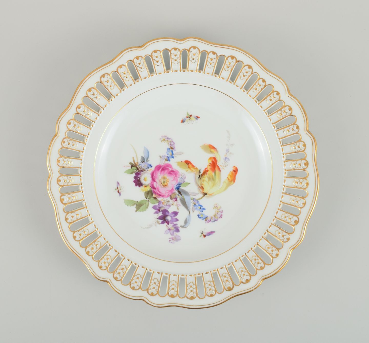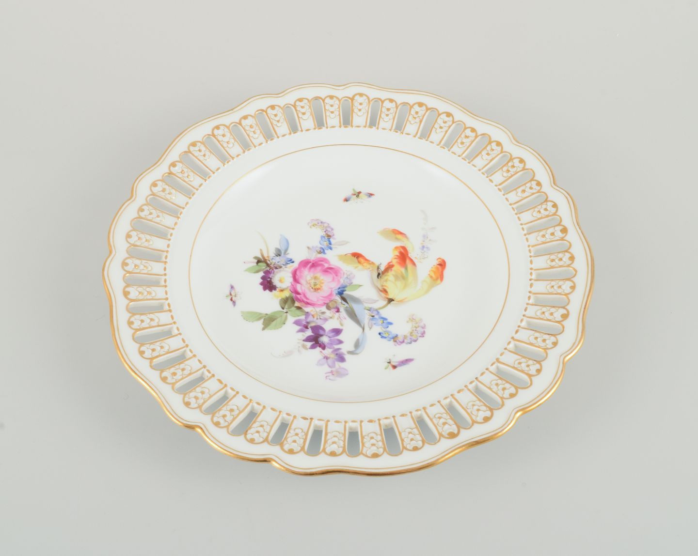 Antik Meissen gennembrudt tallerken i håndmalet porcelæn med blomster og sommerfugle. Sent 1800tallet.