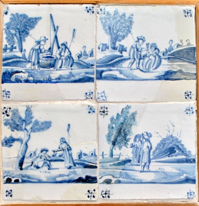 Flise firpas, blådekorerede fliser med personer i landskaber, 18. årh. Holland. Med hjørnedekorationer i form af edderkopper. 13 x 13 cm.