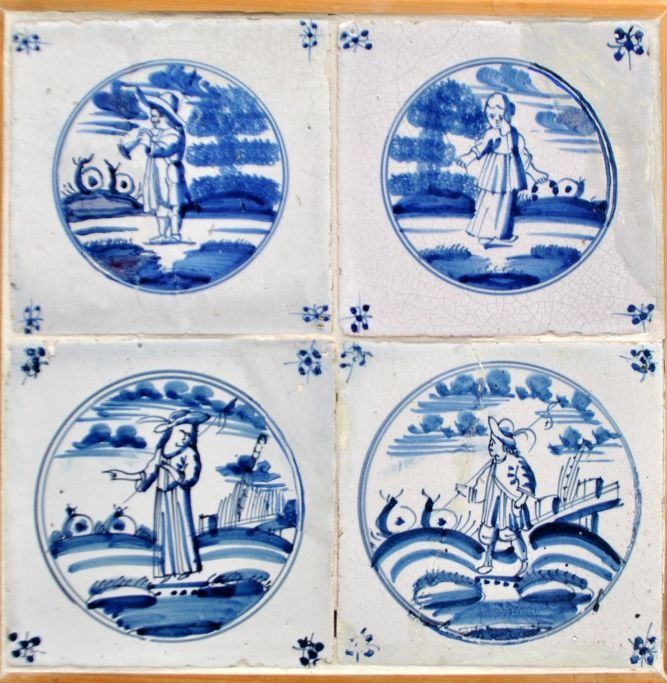 Flise firpas, blådekorerede fliser med med mennesker landskaber, 19. årh. Holland.