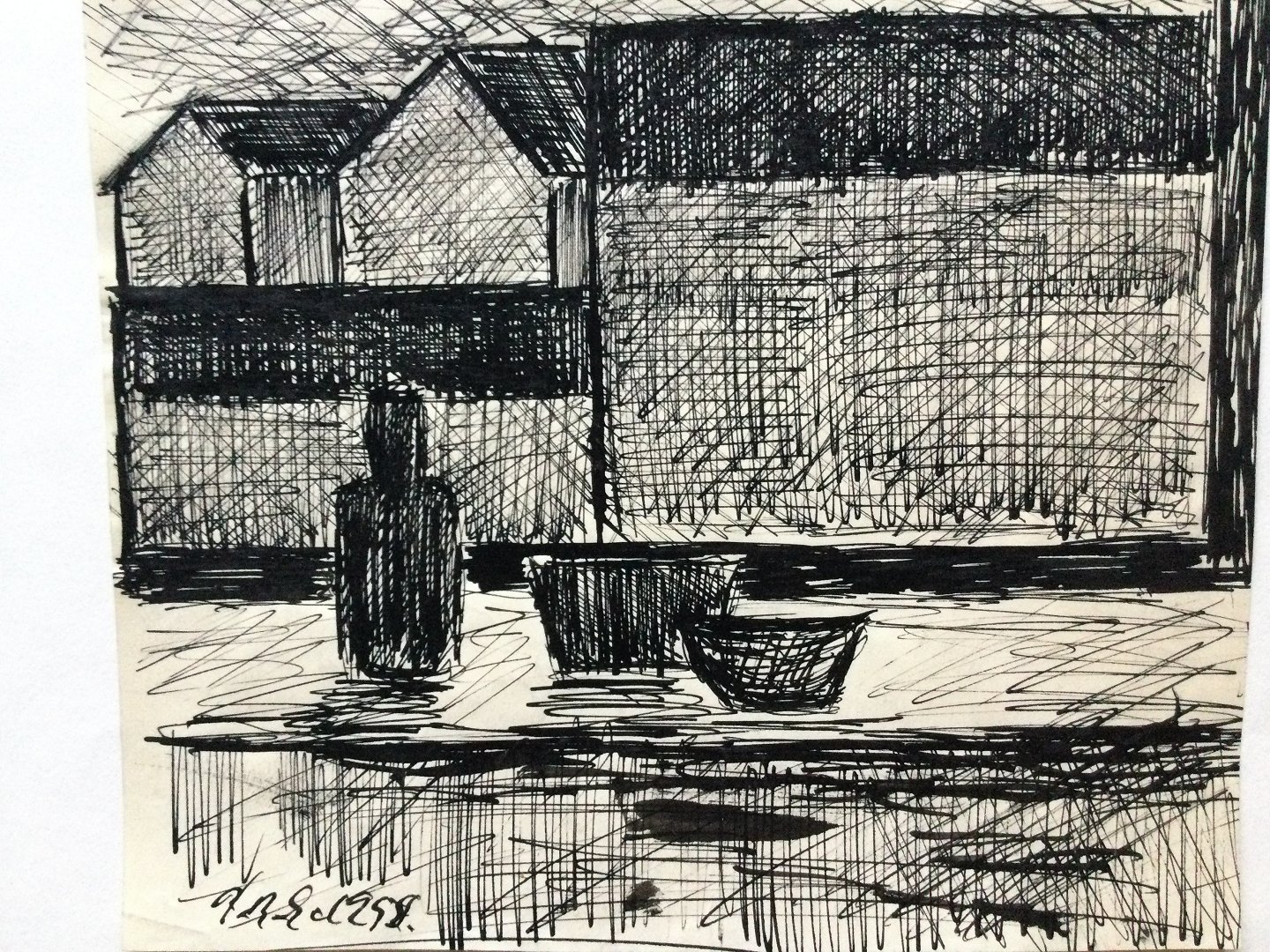 Text available in Danish: Tegning af Peder Brøndum Sørensen - Vindueskarm med flaske og skåle 1958.