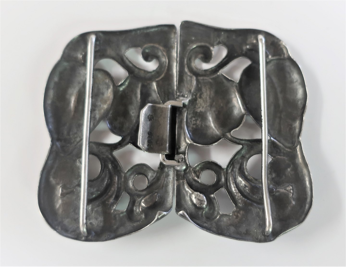 Jugend Sølv bæltespænde (830) med 6 grønne sten. Længde 7 cm. Bredde 6 cm. Stemplet 830S og IH i slyng.