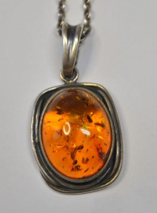 Rav vedhæng i sterlingsølv, 20. årh. Stemplet. Med kæde. Kædelængde: 50 cm.
