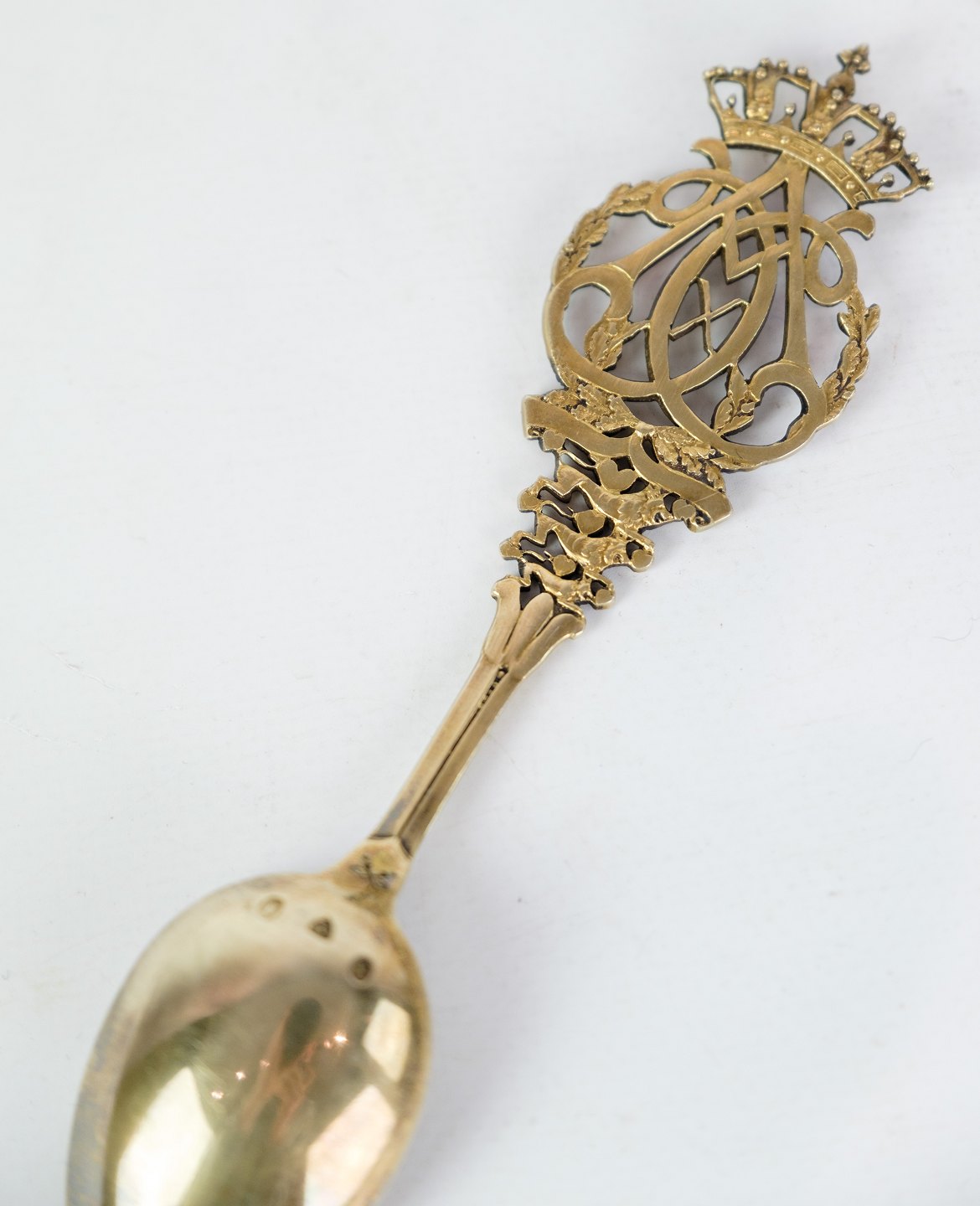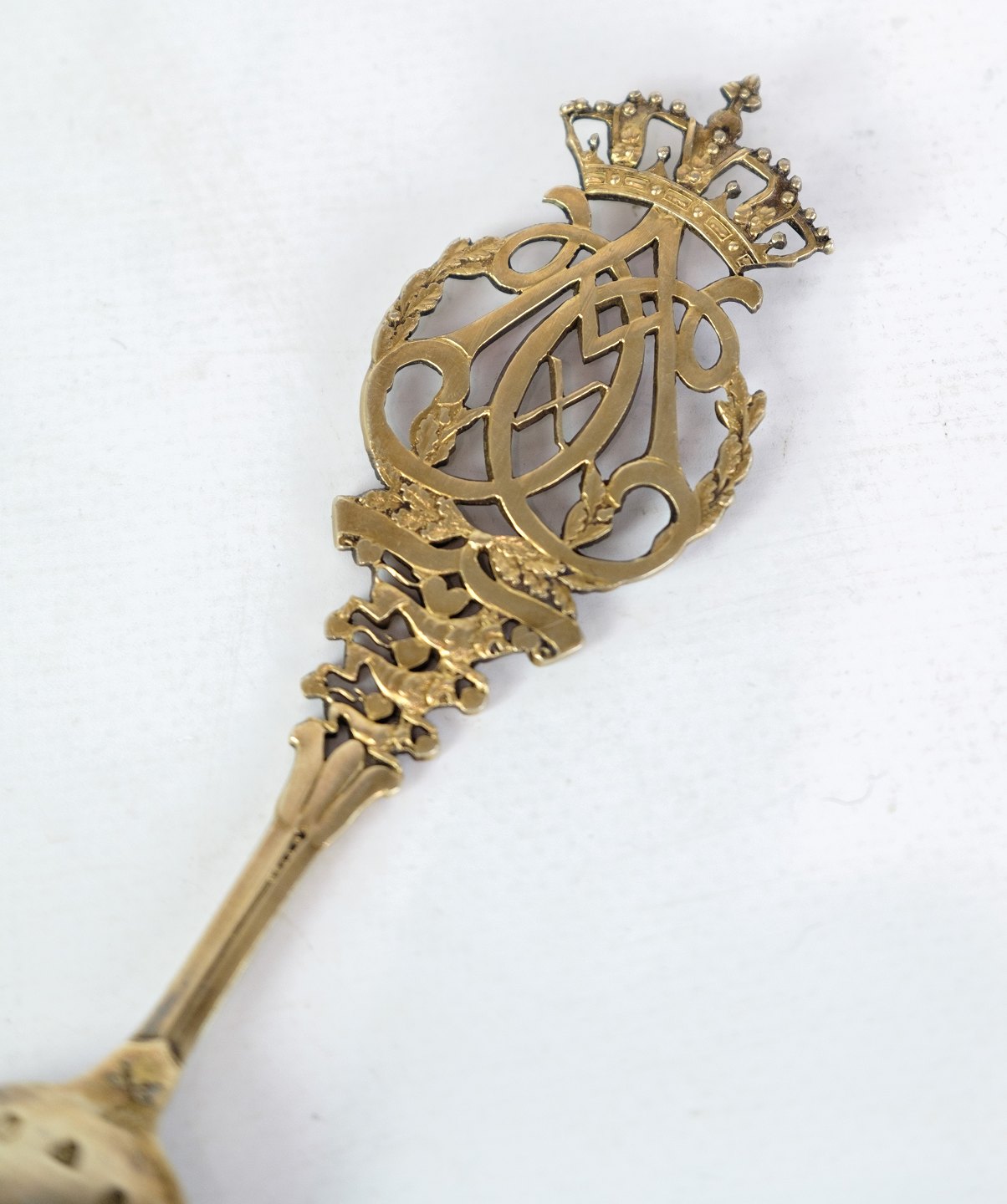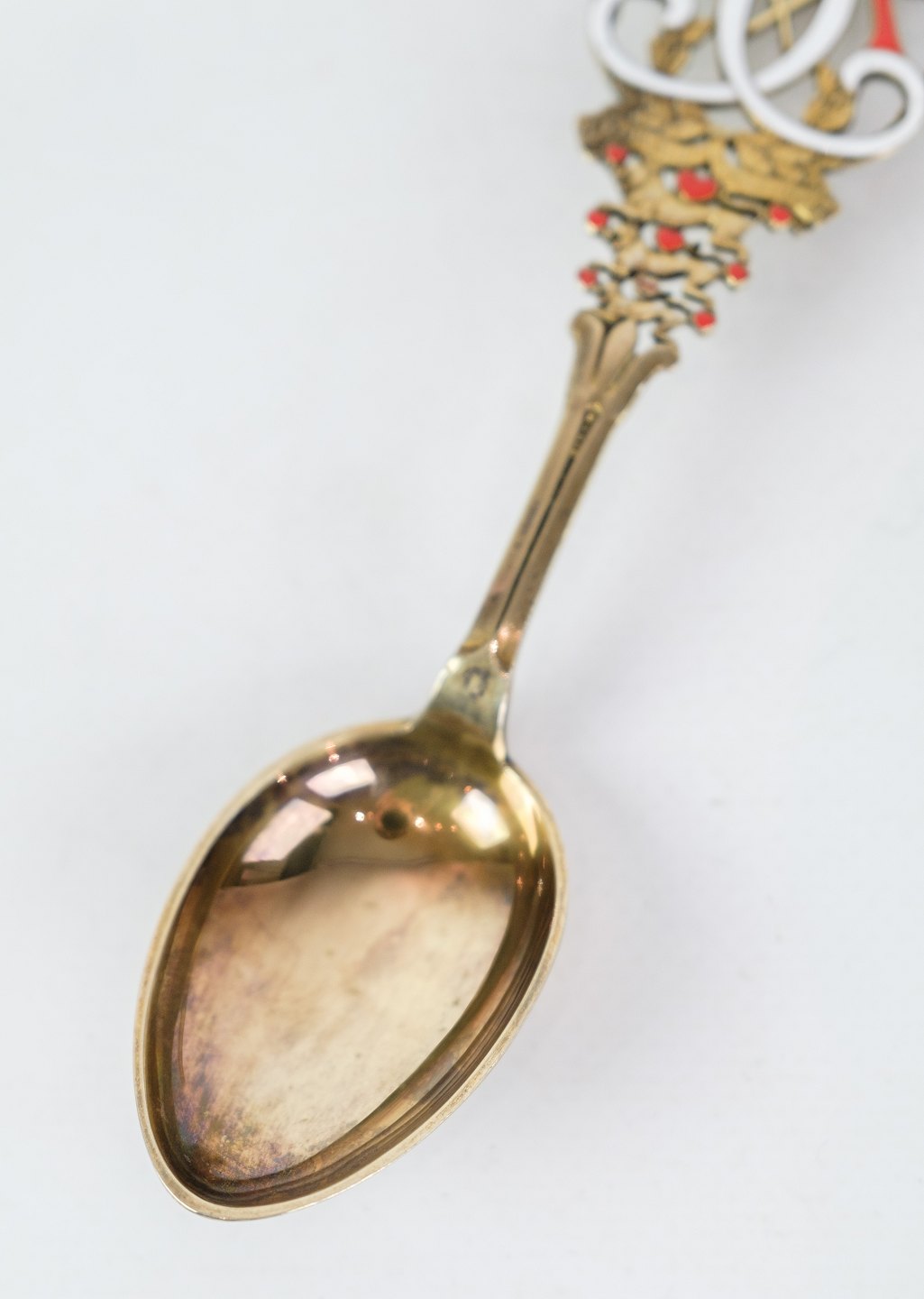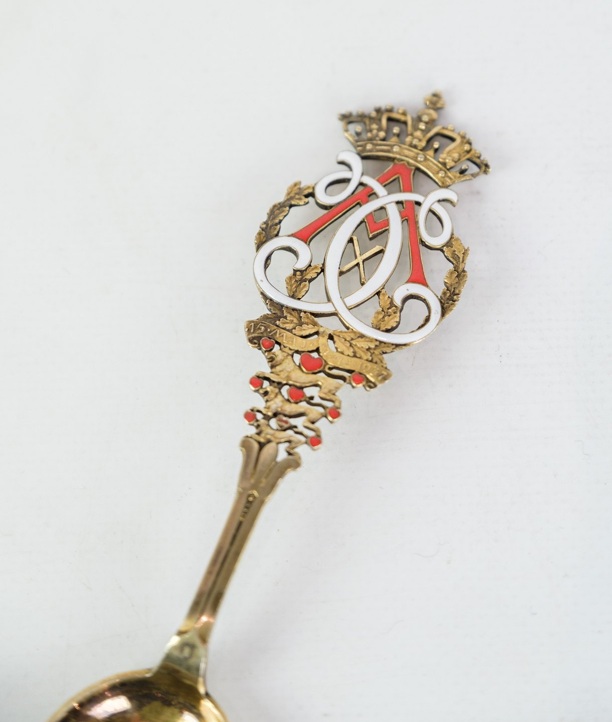 Jubilæumsske af A. Michelsen i forgyldt sterling sølv dekoreret med hvid og rød emalje i anledning af Kong Kristian X's 25 års regeringsjubilæum d. 15 maj 1912 - 1937. Hvilket er indgraveret på skeen.