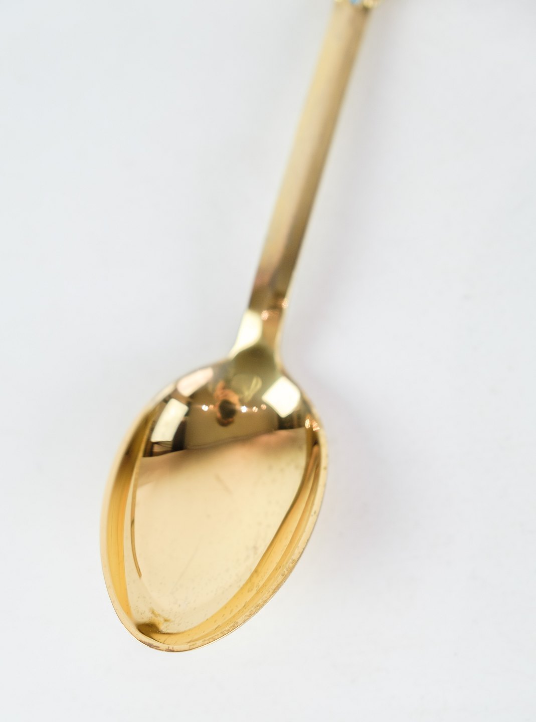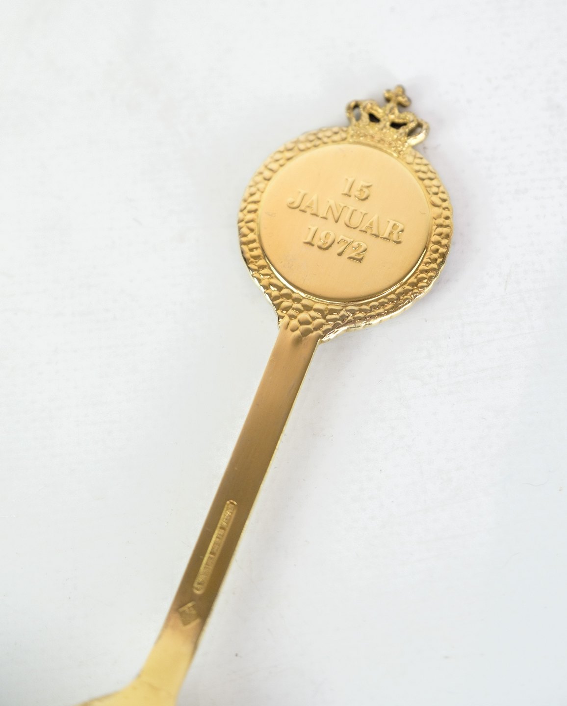 Jubilæumsske af A. Michelsen i anledning af Dronning Margrethe II's kroning, sterlingsølv. Fremstillet af forgyldt sterlingsølv med emaljedekoration.