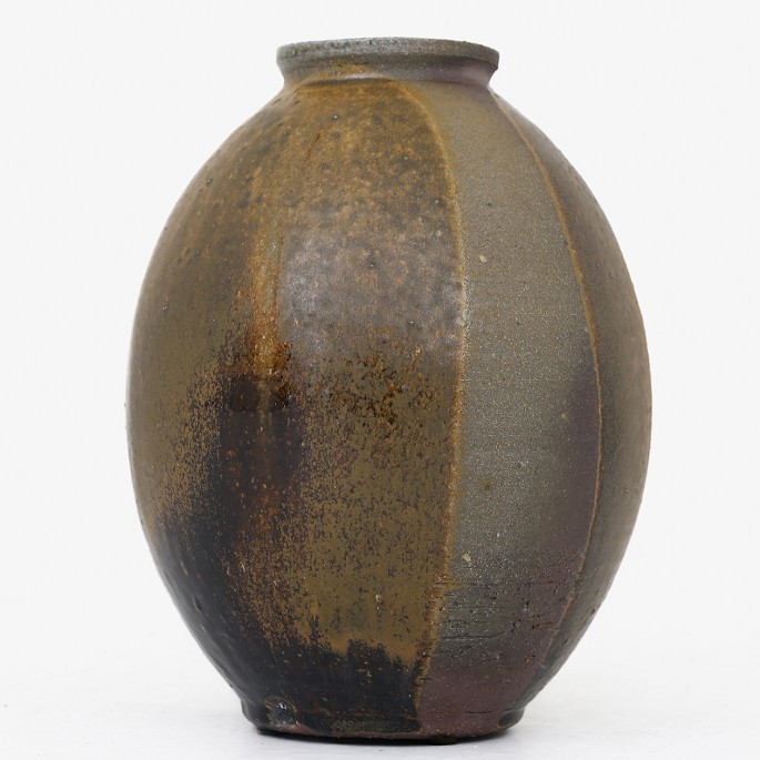 Round vase in raku-fired stoneware with dark glaze.