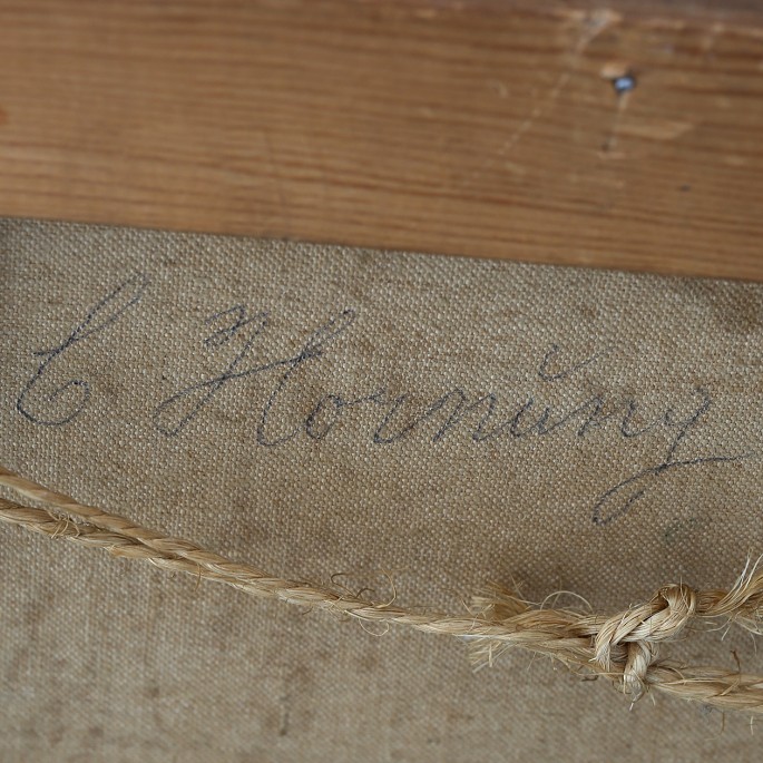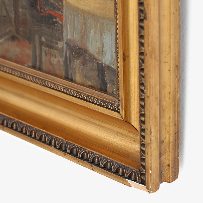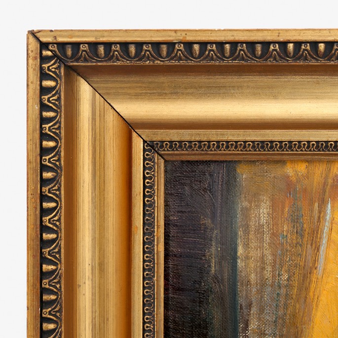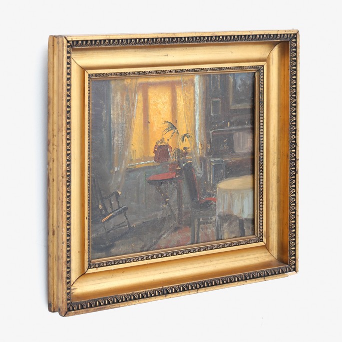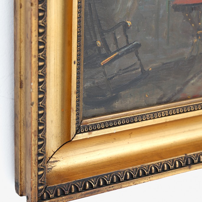 Painting, oil on canvas of interior in original gold frame. Signed. Ca 1920.
