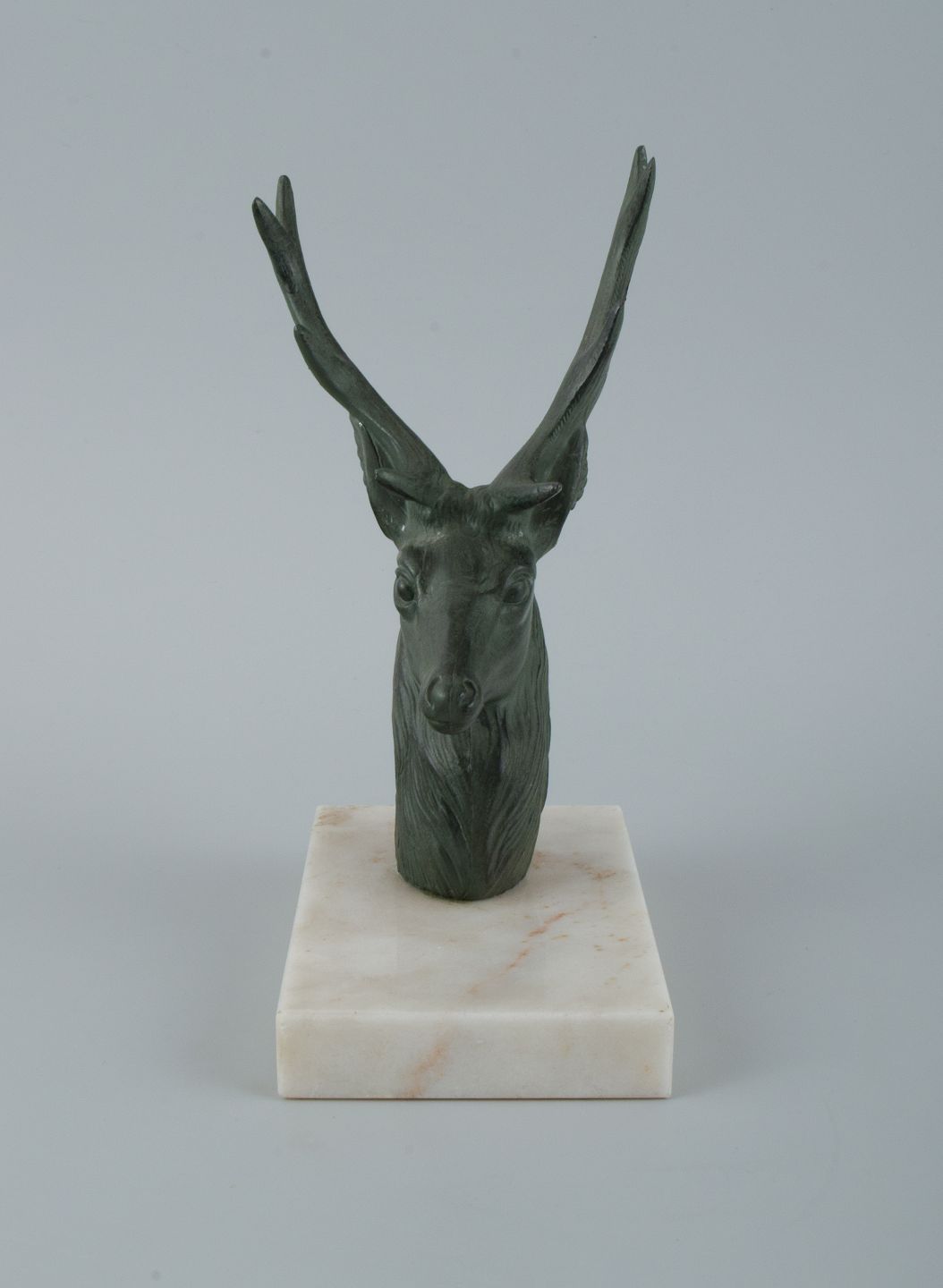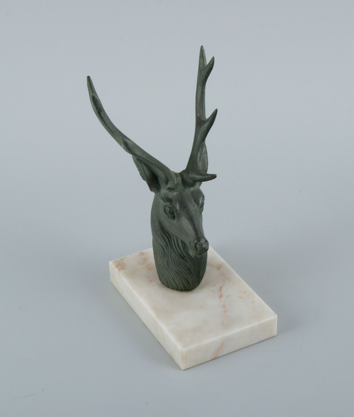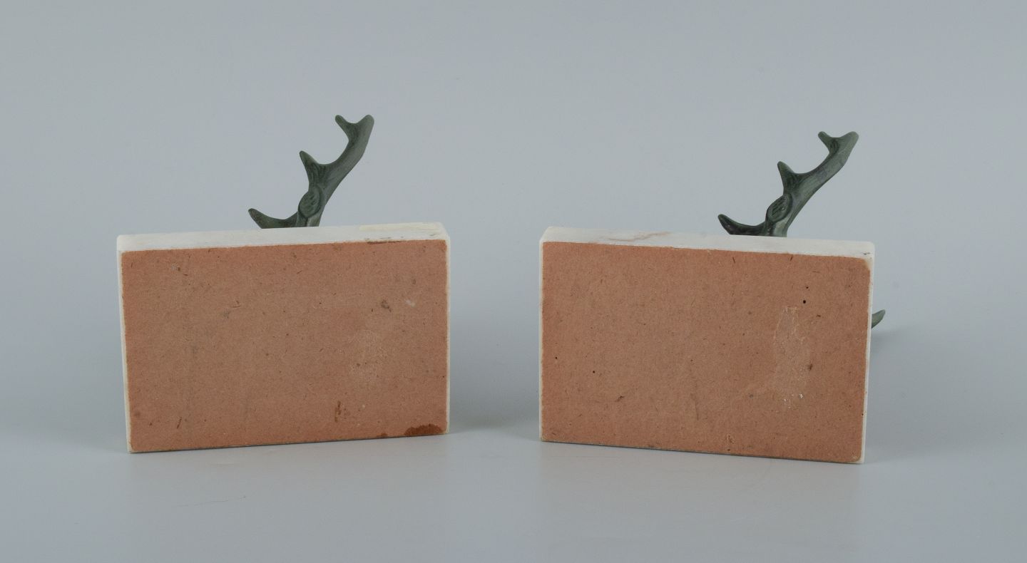 Et par franske art deco bogstøtter. Kronhjorte i patineret metal på marmor base.