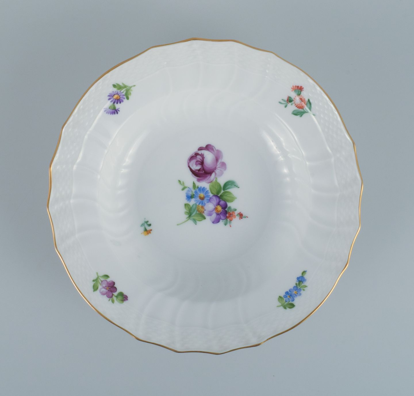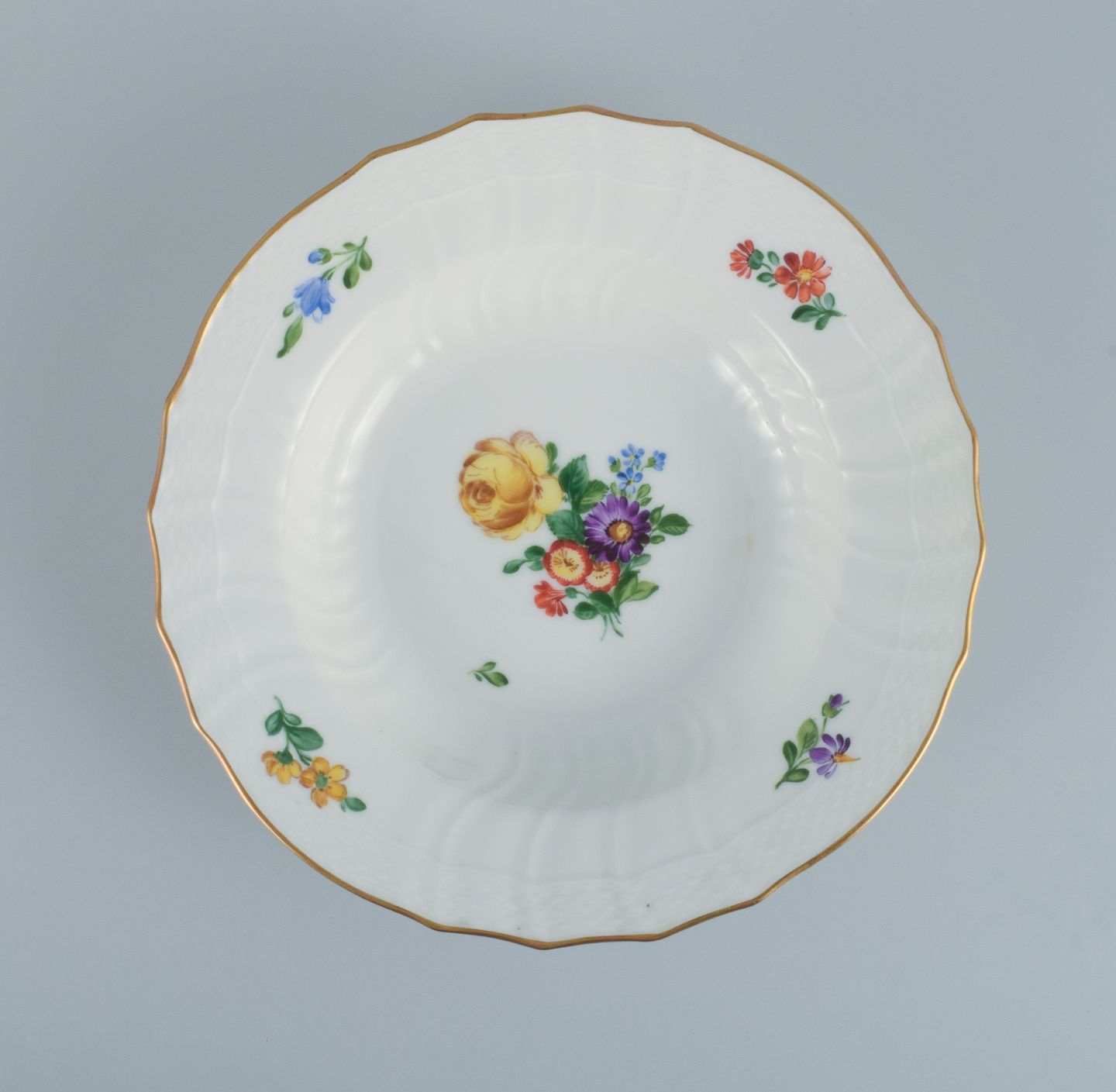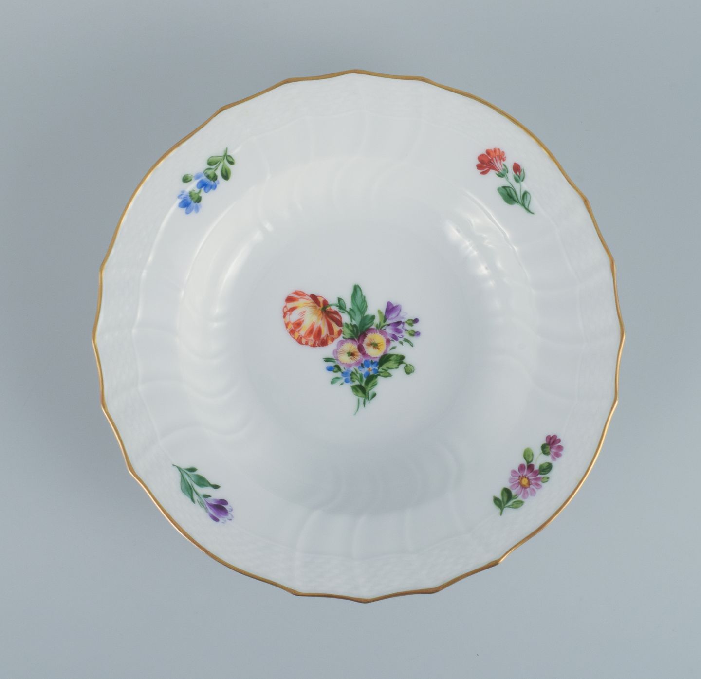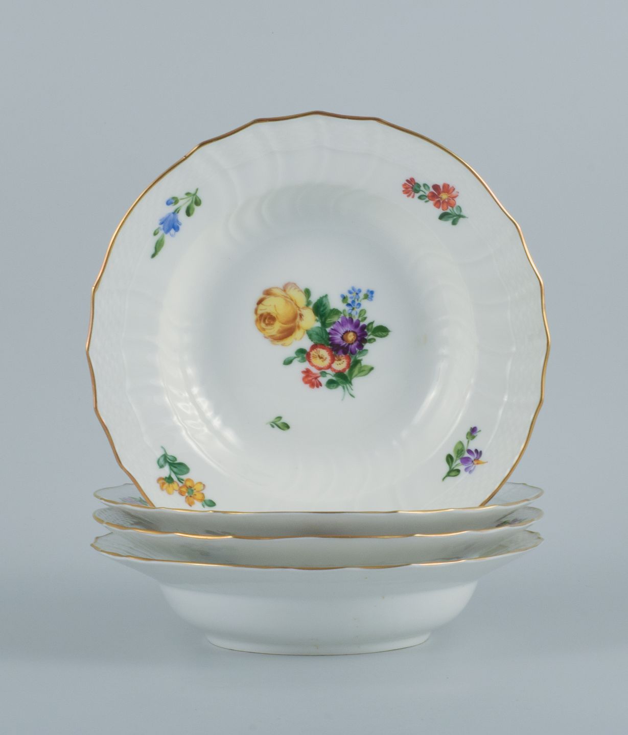 Royal Copenhagen Let Saksisk Blomst. Fire dybe tallerkener i håndmalet porcelæn.