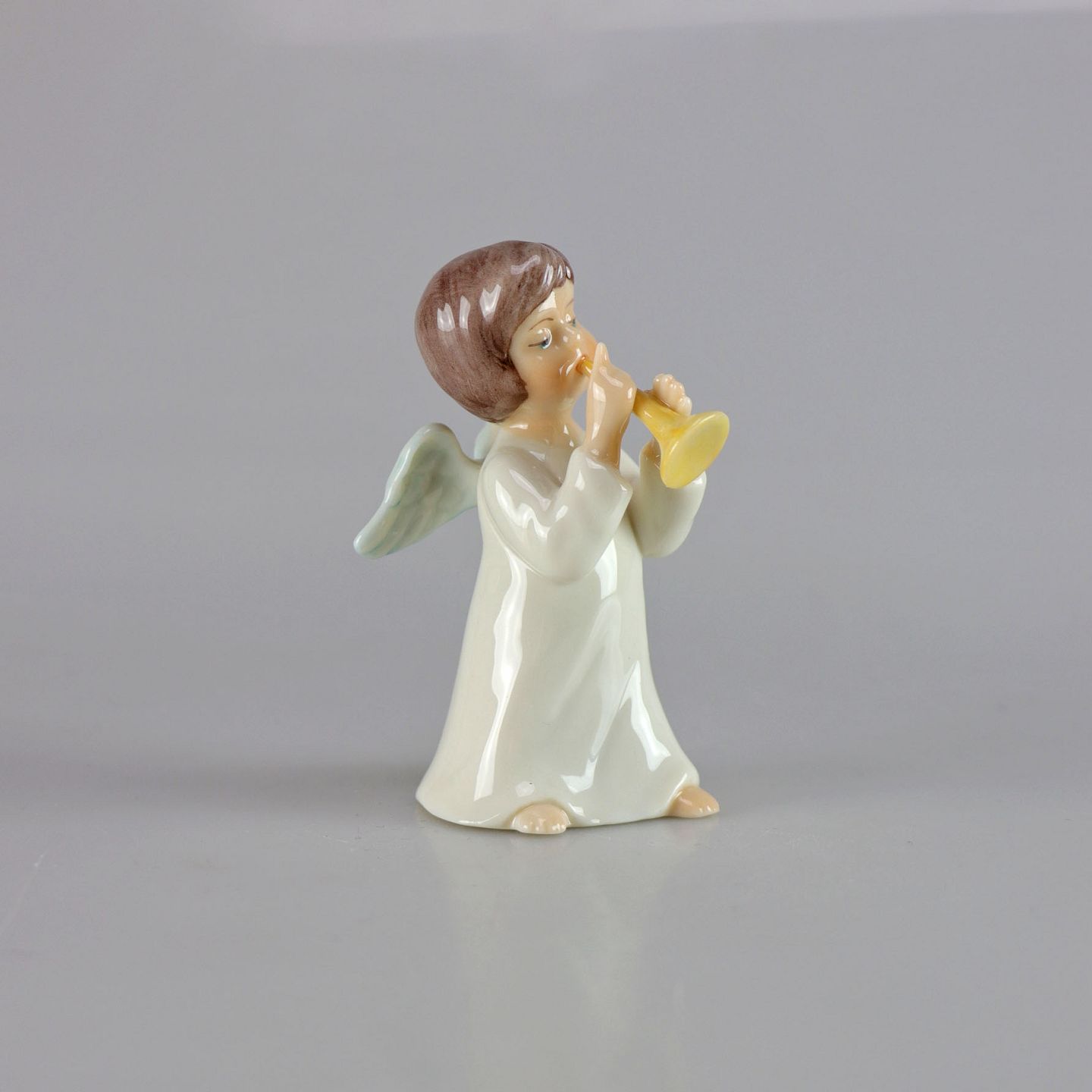 Lille porcelænsfigur med motiv af engel som spiller på trompet