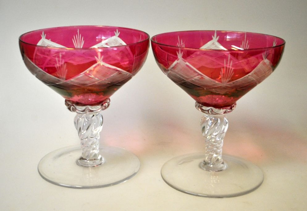 Champagne kummer i krystal, 20. årh. Böhmen. Snoet fod. Kumme med rødt overfangsglas og slibninger. H.: 11 cm. Dia.: 10 cm.