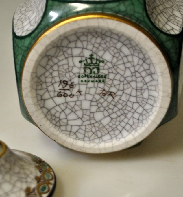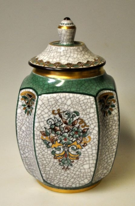 Dahl Jensen lågkrukke i craquelle, 196/600, 20. årh. København, Danmark. Håndmalet med blomstermotiver, grønt og forgyldninger. Stemplet. H.: 18 cm.