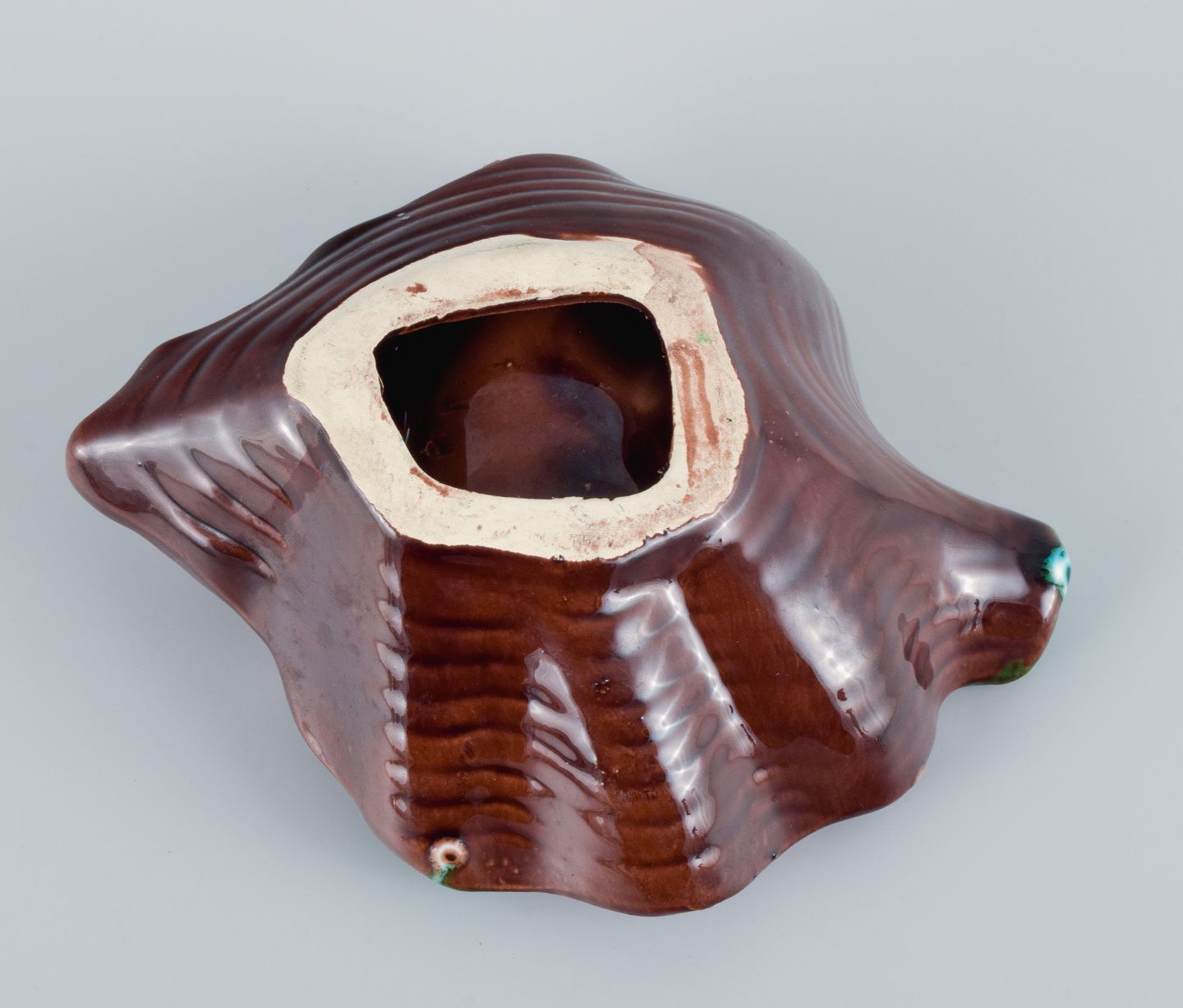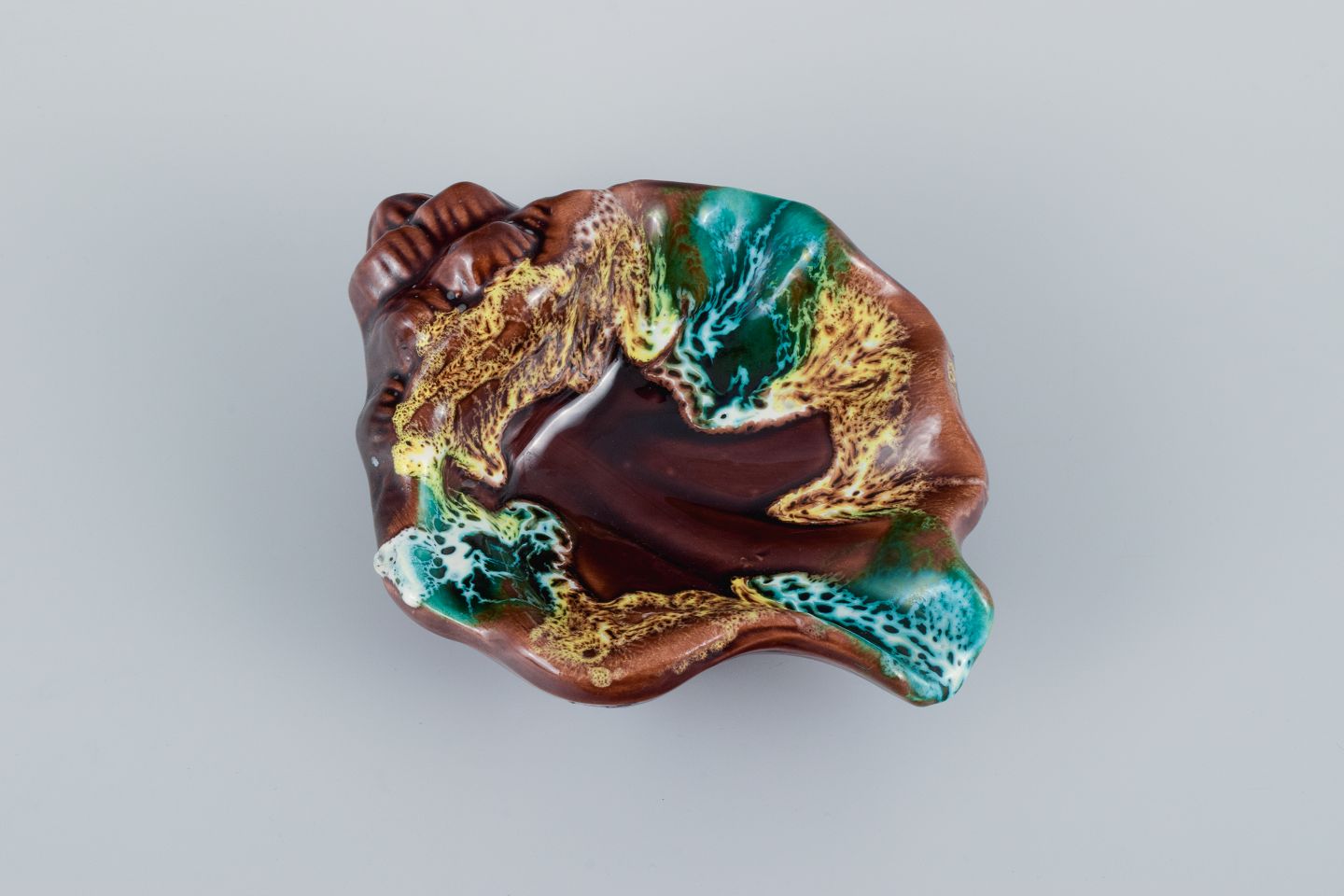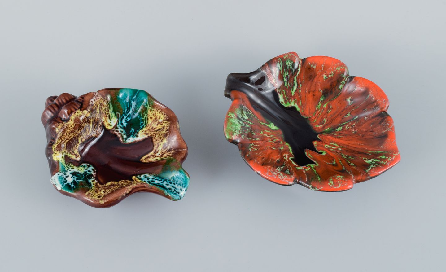 Vallauris, Frankrig, to bladformede fade i farvestrålende glasurer.