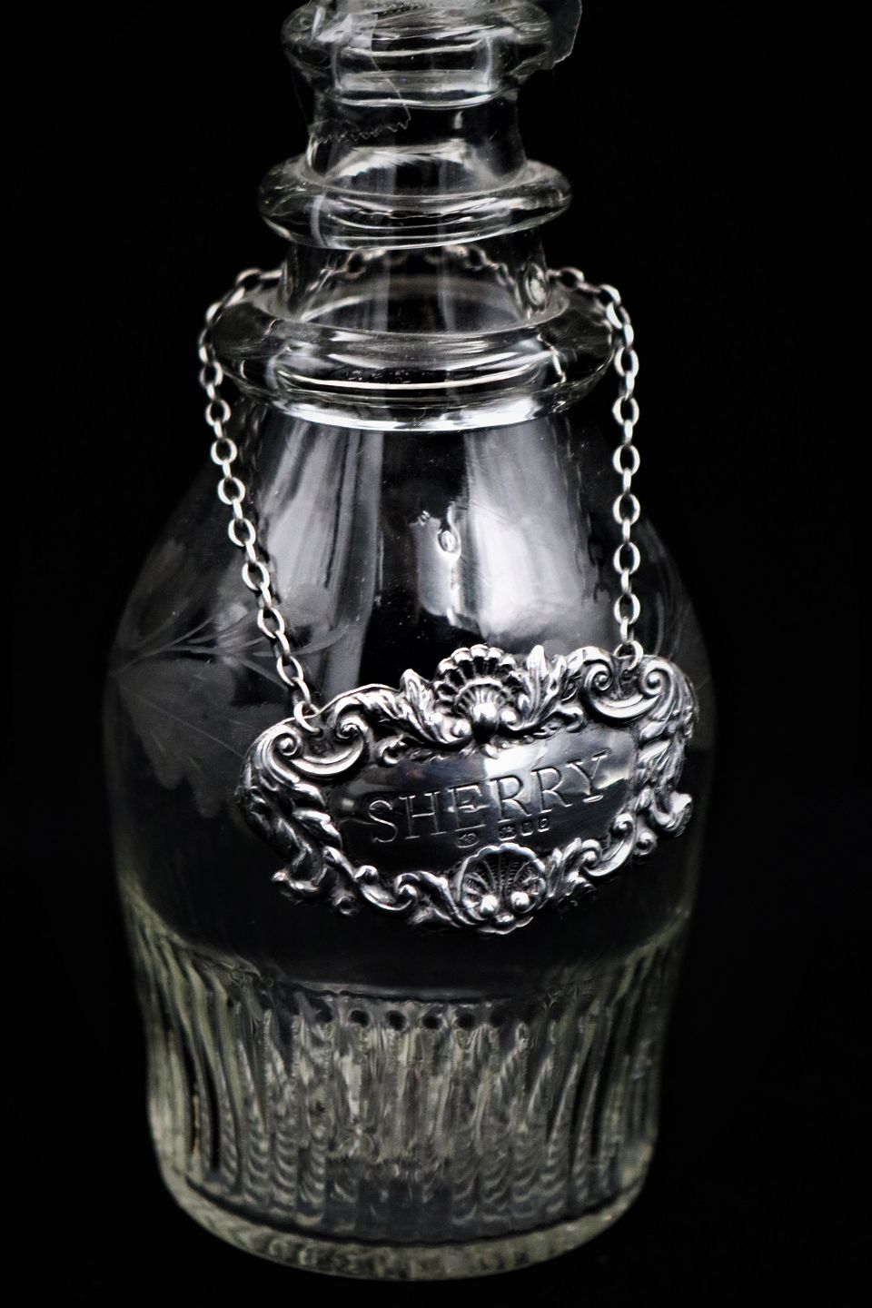 Gammelt spiritus skilt " Sherry " i sølv , stemplet med kæde til at hænge om halsen på karaffel. 5,5x3,3xm.