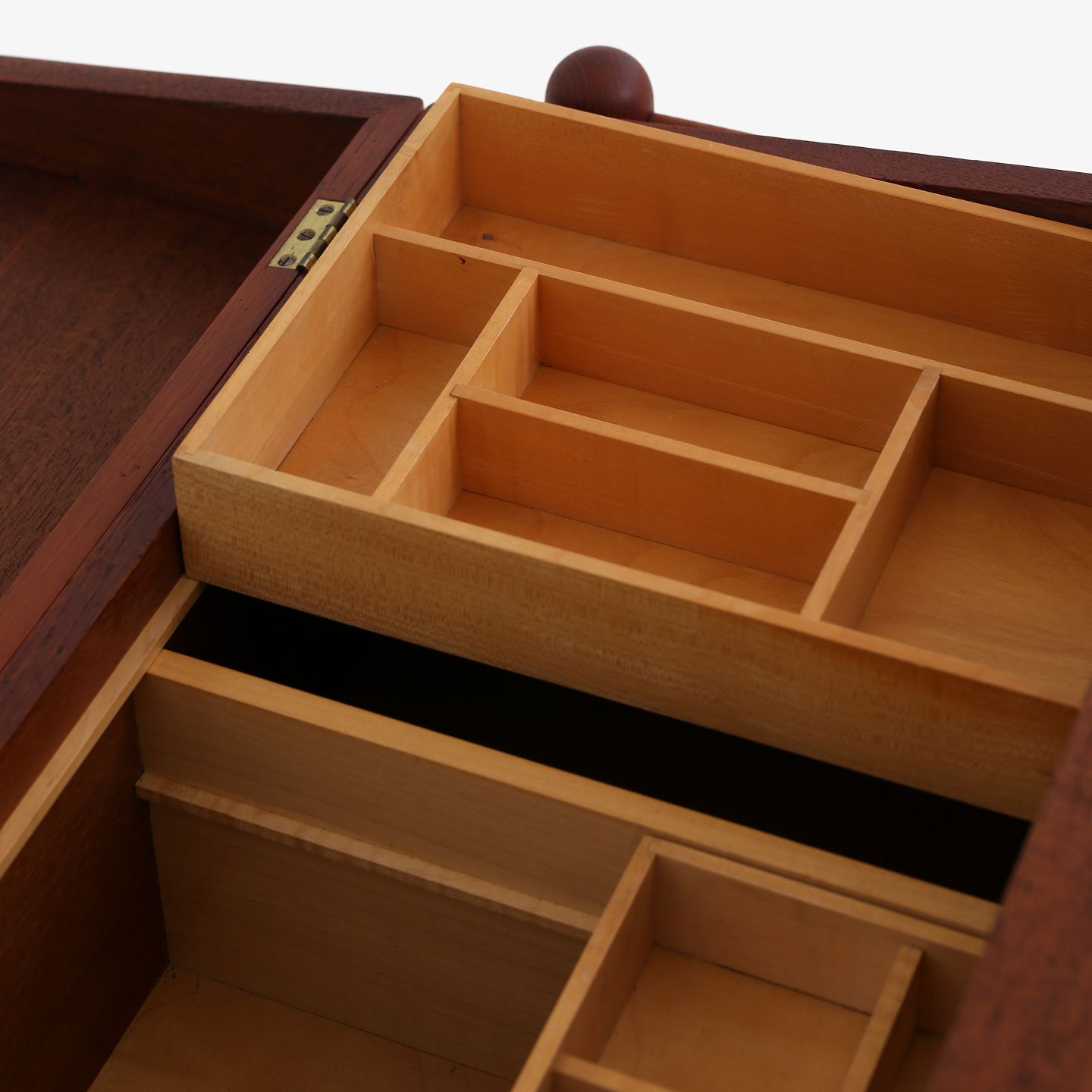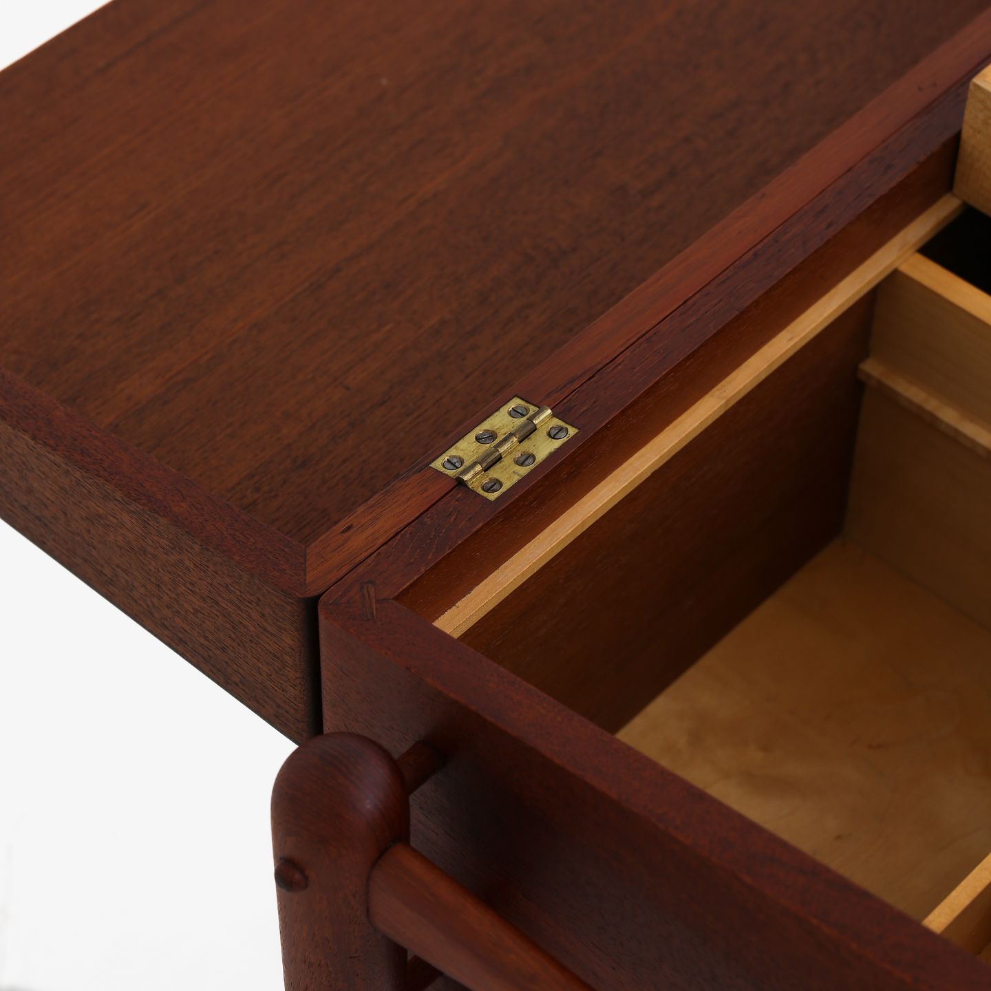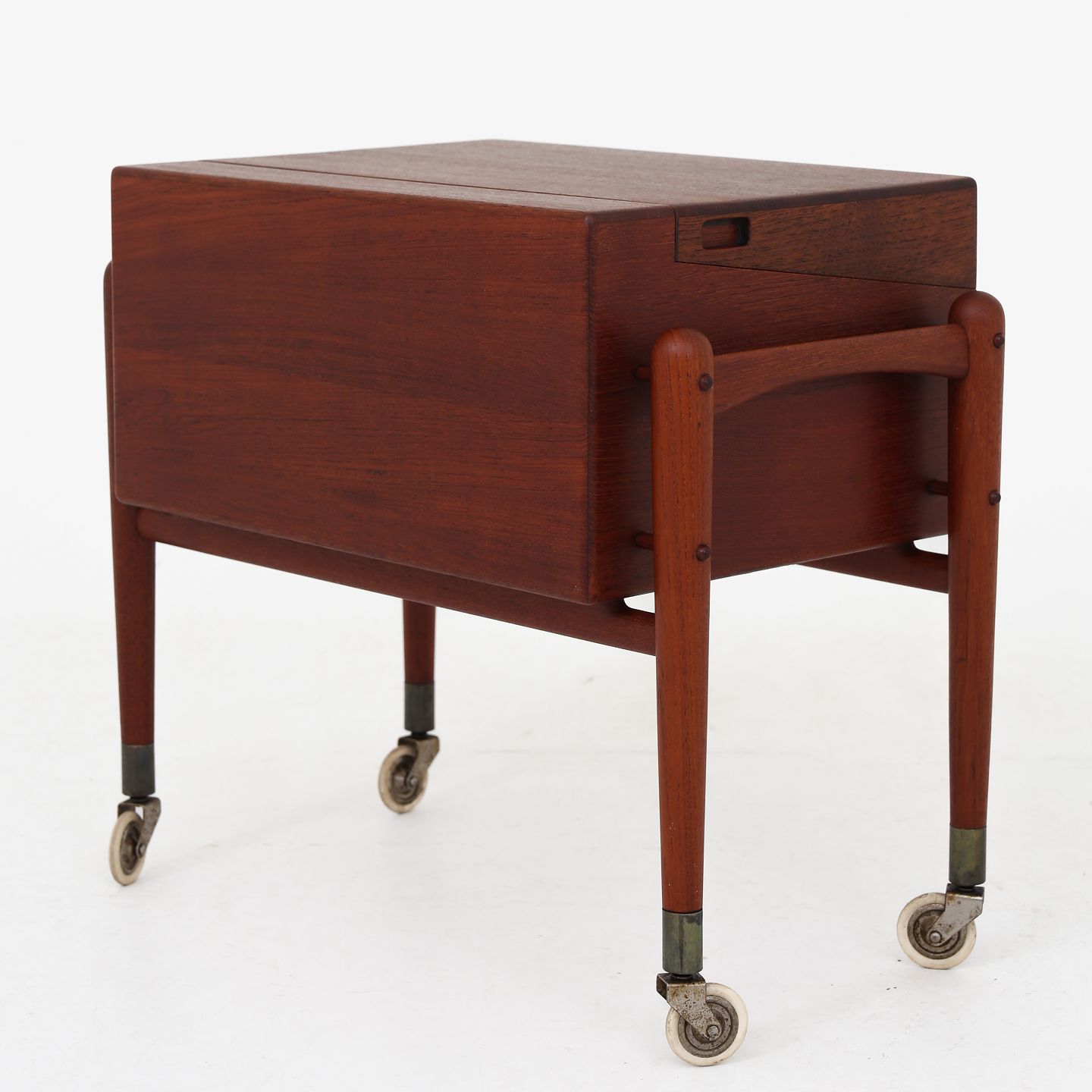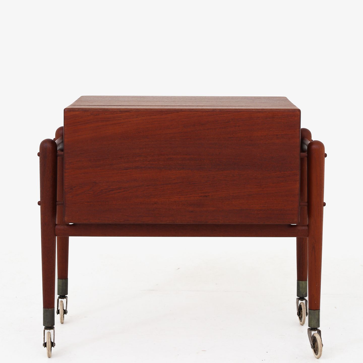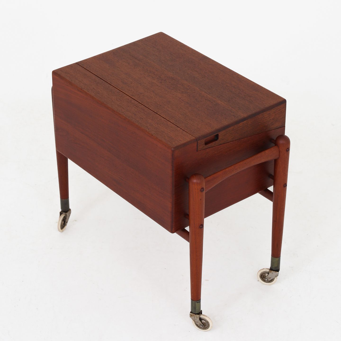 Sjældent sybord i teak og ahorn på hjul fra 1950'erne.