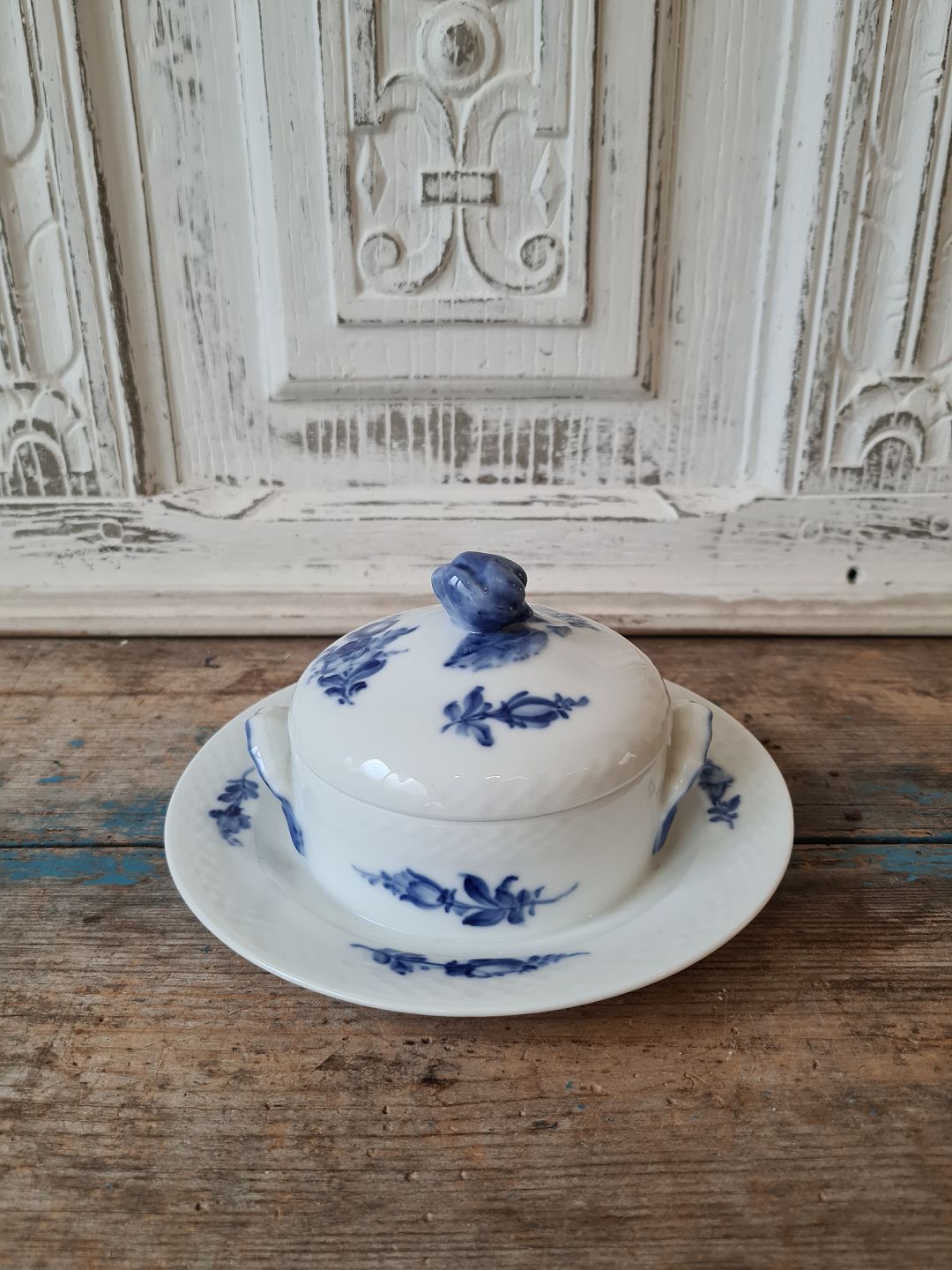 Text zugänglich auf Dänische: Royal Copenhagen Flettet Blå Blomst smørskål på fast underfad
