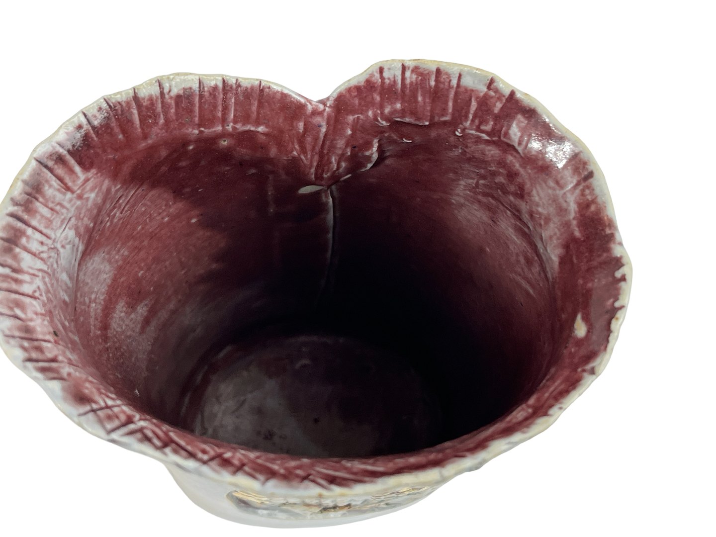 Smuk vase af keramik med motiv af fugle i rede. Signeret med monogram GØ for Gerda Østergaard. Eget værksted. Etiketmærket: Dansk Kunsthåndværk. Farverne veksler mellem grå, beige rosa / pink samt guld.