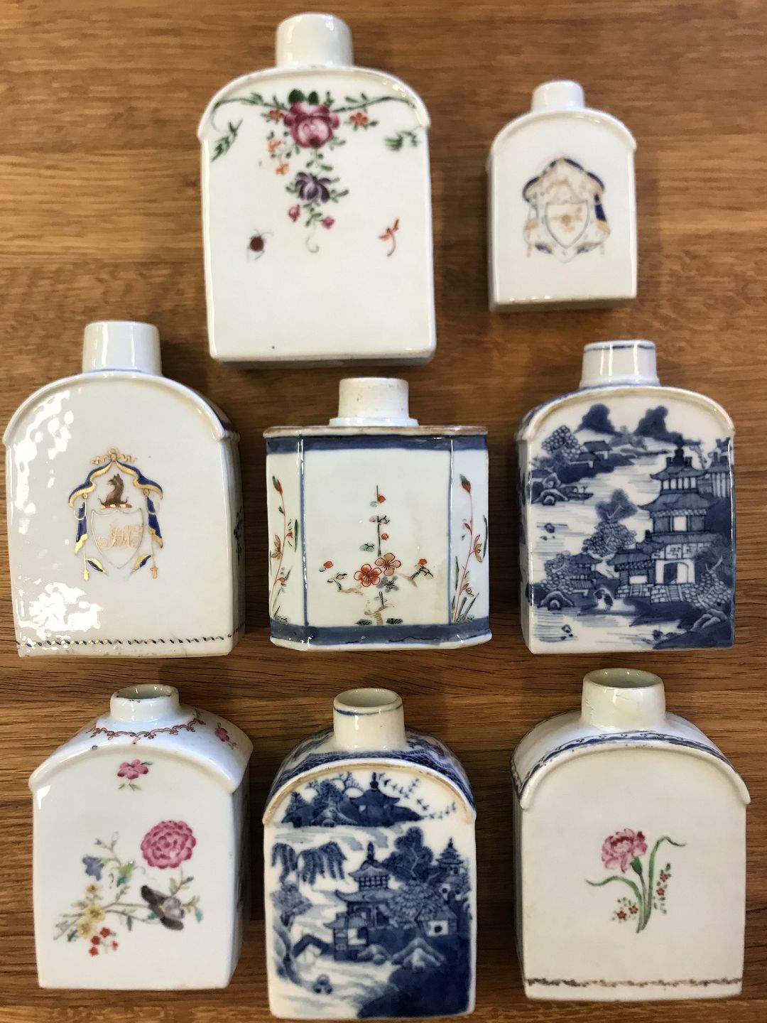 Ostindiske tedåser. Kina 1780-1800. Med våbenskjold, blomster, indlejret, huse og landskaber.