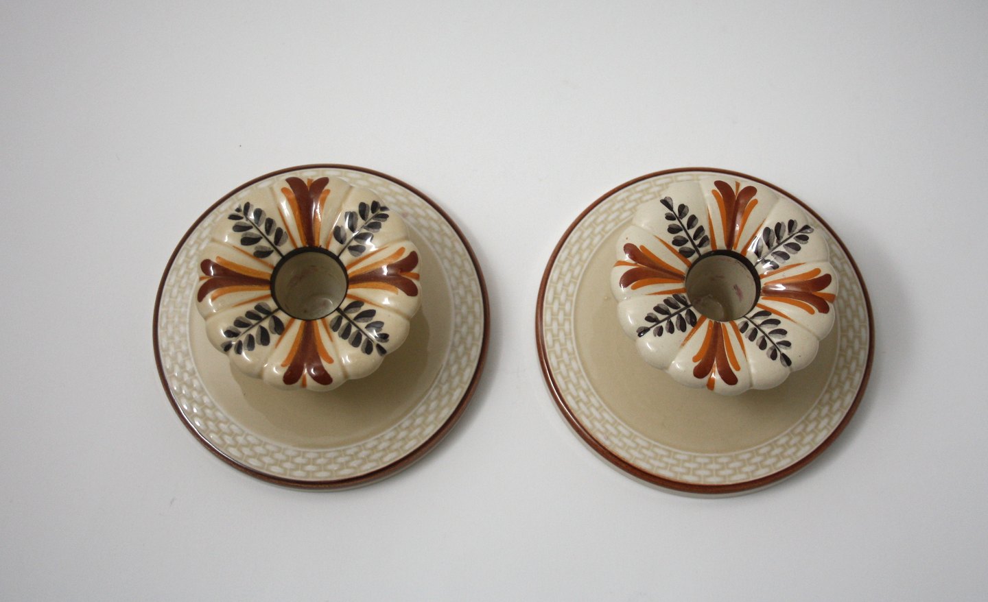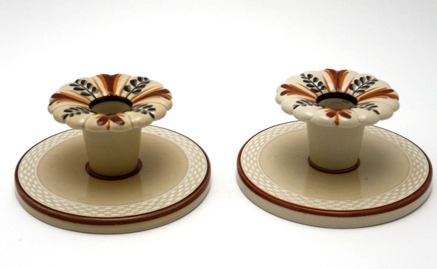 Knud, Aluminia fajance. Design Niels Thorsson. Håndmalet. Produceret i perioden 1934-1963. Lysestage. Højde 6 cm. Diameter 12 cm. Dek.nr. 262. Pris: 200 kr. stk. Lager: 2