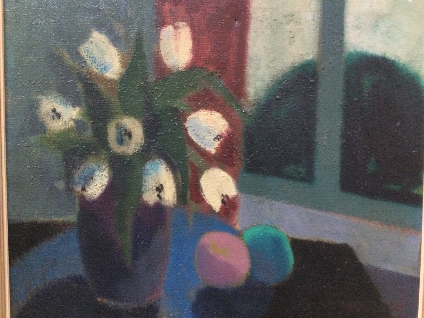 Maleri af Knud Horup - Opstilling med hvide tulipaner og frugter i vindueskarm.
