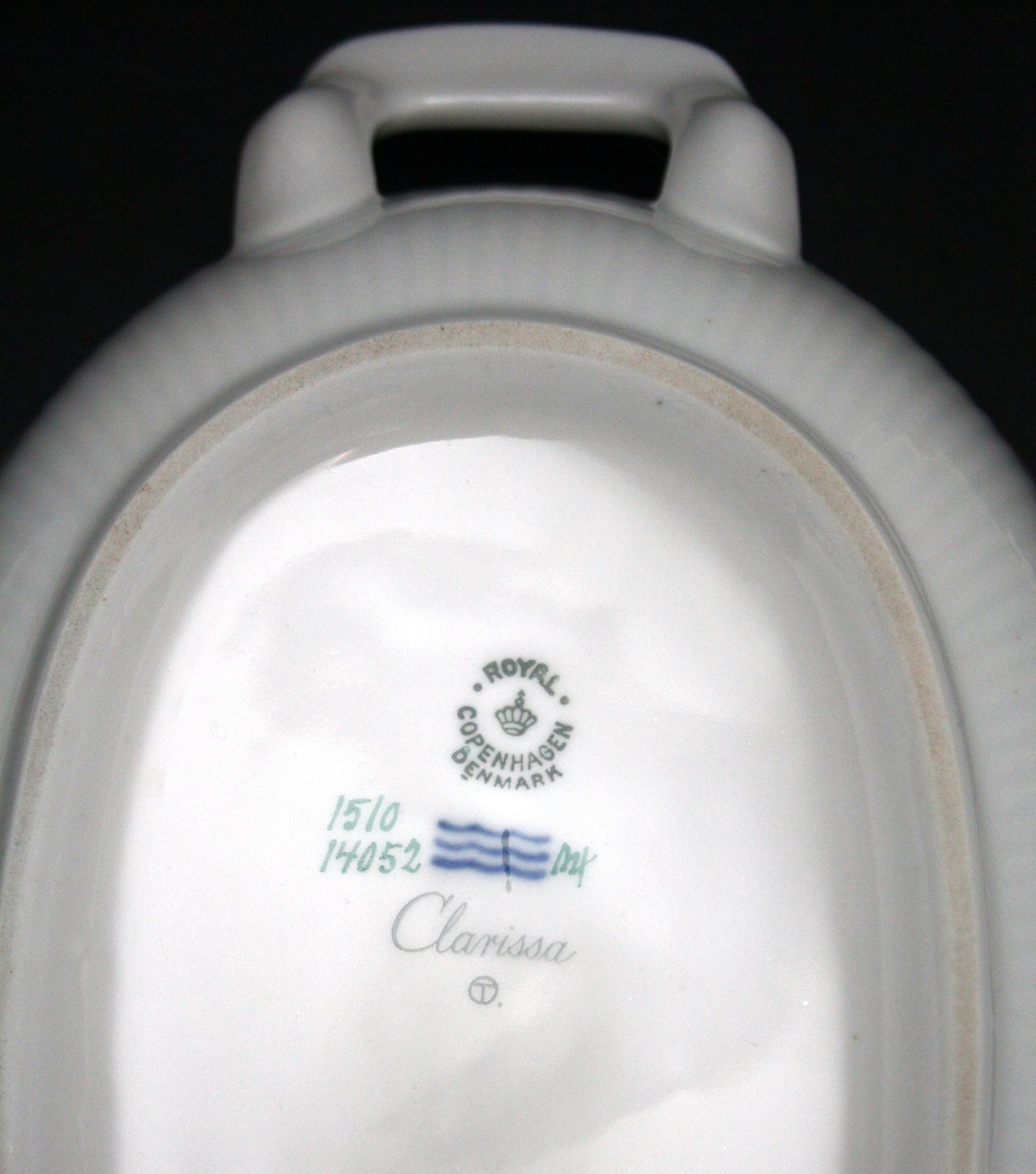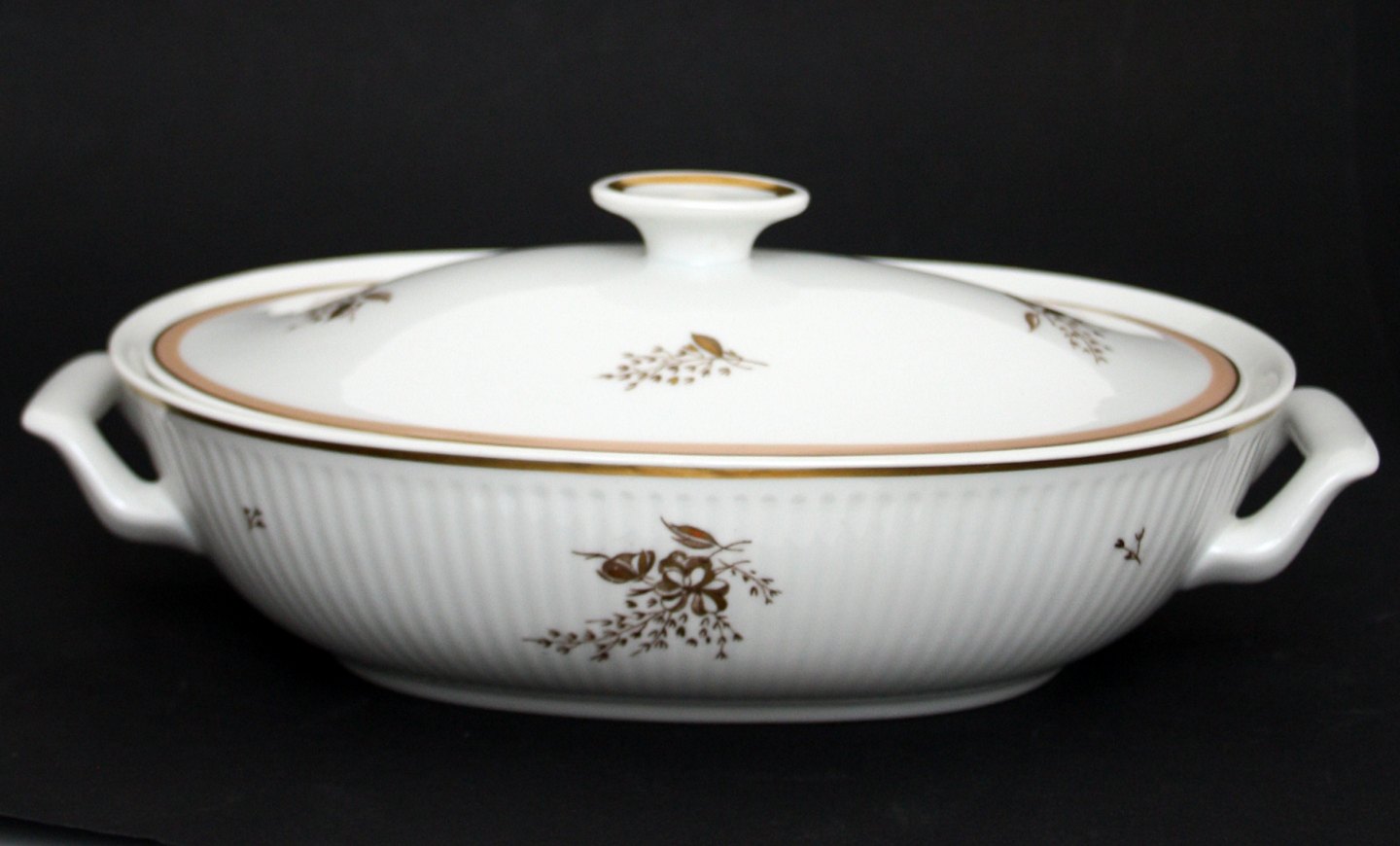 Royal Copenhagen, Clarissa. Designet af Thorkild Olsen i 1950'erne. Hvidt riflet stel med guld- og rosa/beige kanter, samt blomstermotiv i guld. Terrin, lågfad. Nr. 1510/14052. Længde 29,5 cm. Bredde 18 cm. Højde 10,5 cm. II. sortering. Fin stand. Pris: 475 kr. stk. Lager: 1