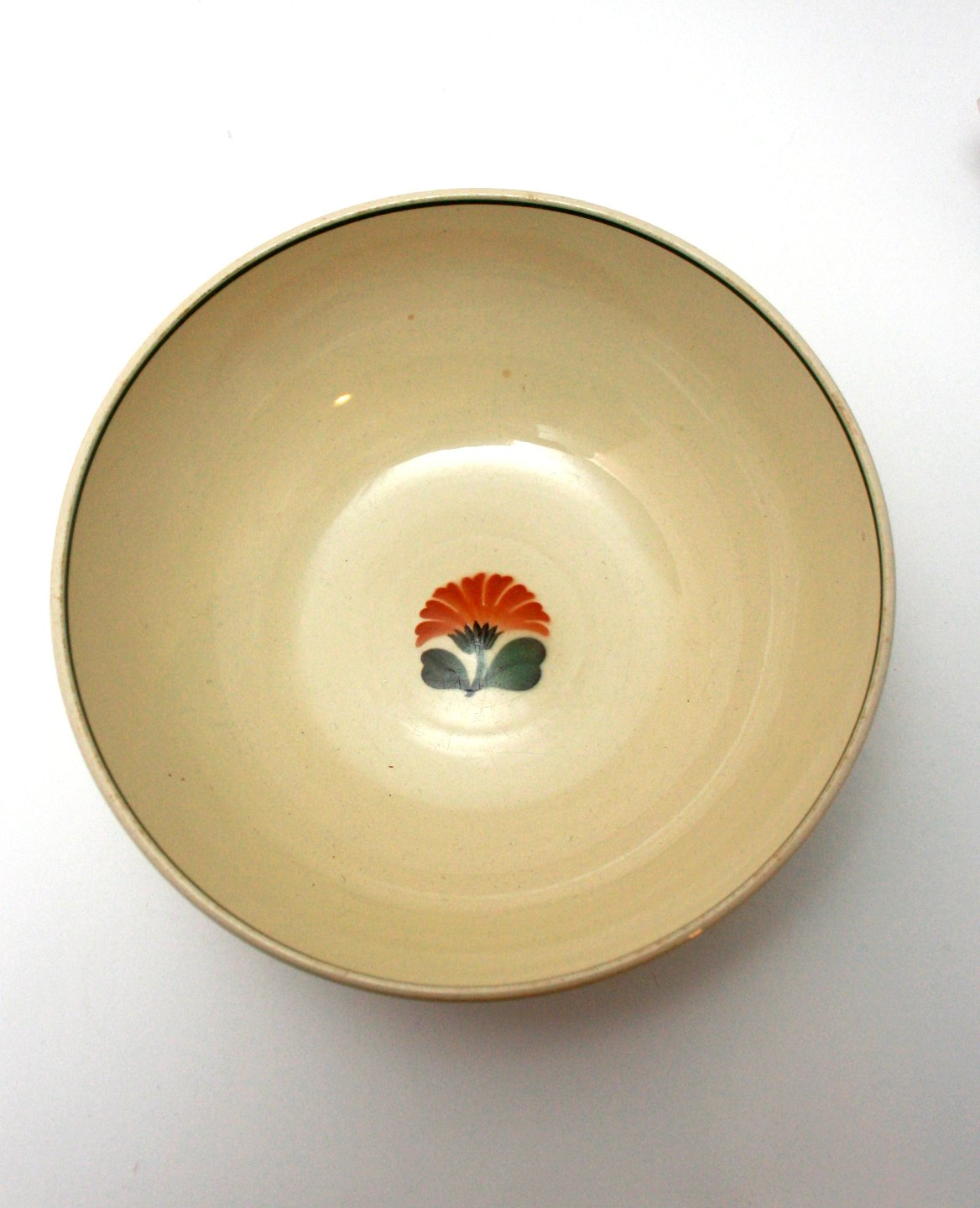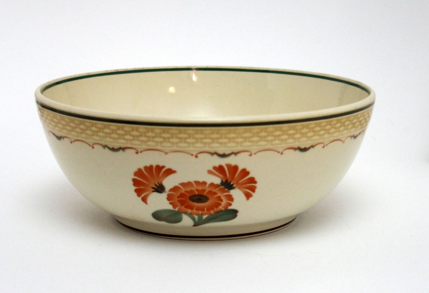 Text available in Danish: Aluminia, Morgenfrue. Designet af Niels Thorsson. Produceret i perioden 1934-1967. Luftmalet. Serveringsskål, kartoffel eller salatskål. Højde 8 cm. Diameter 21 cm. Pris: 350 kr. stk. Lager: 1