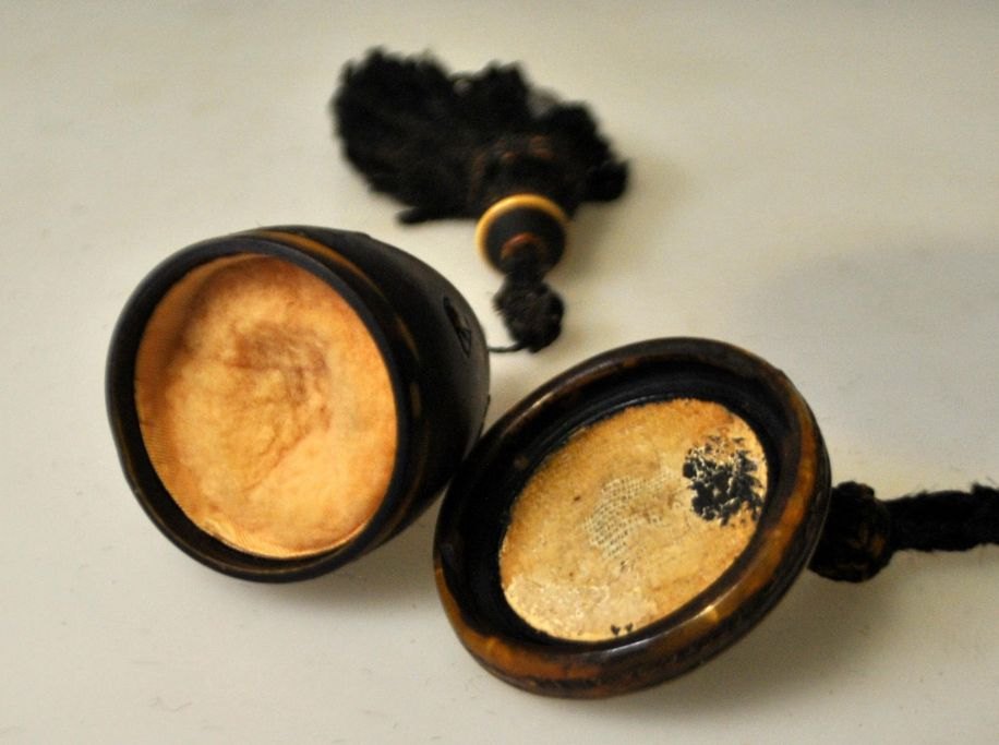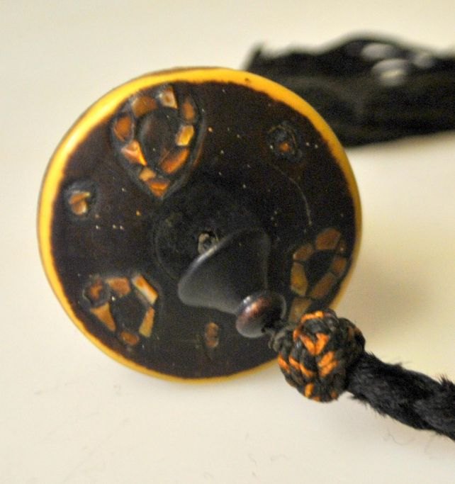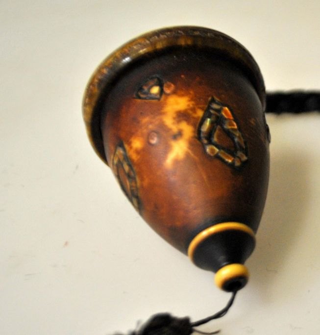Japansk trææg til parfune/pudder, 19. årh. Drejet i træ med indlagt perlemor og ben. Højde æg: 6 cm. Længe med ring m.v. 38 cm.