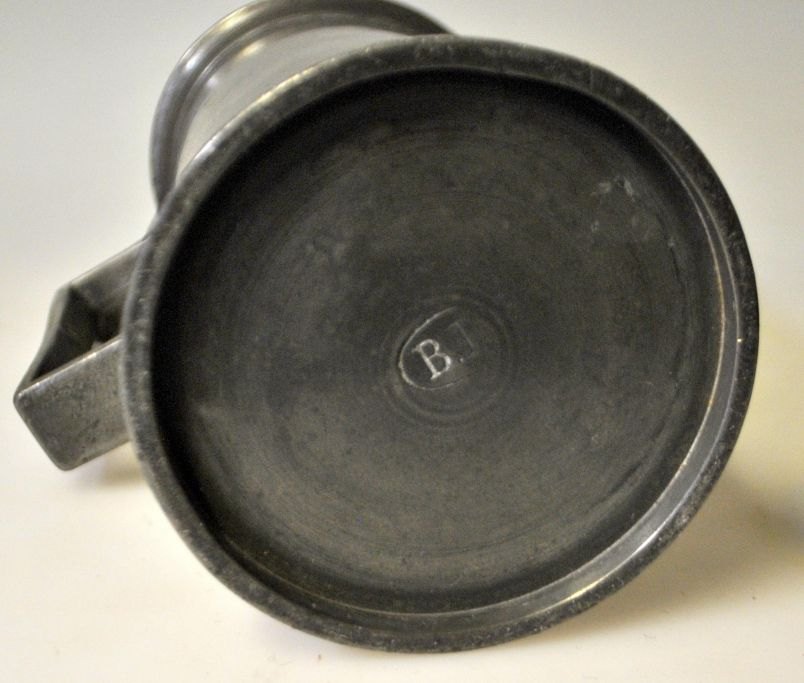 Tin måle krus, 19. årh. Danmark. Med justeringsstempler. Stemplet.: B.P. H.: 18,5 cm.