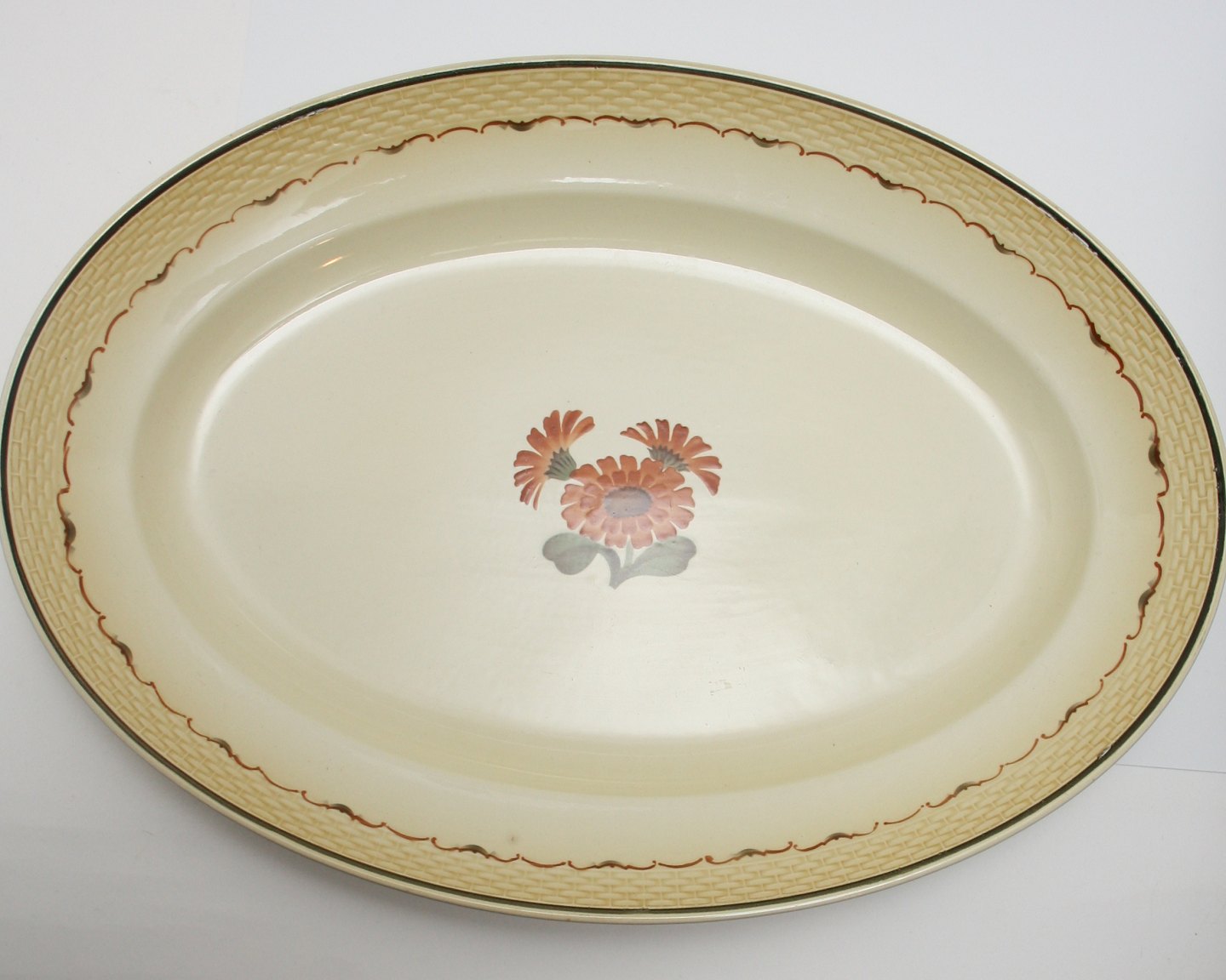 Aluminia, Morgenfrue. Designet af Niels Thorsson. Produceret i perioden 1934-1967. Ovale fade. Almindeligt brugsslid.