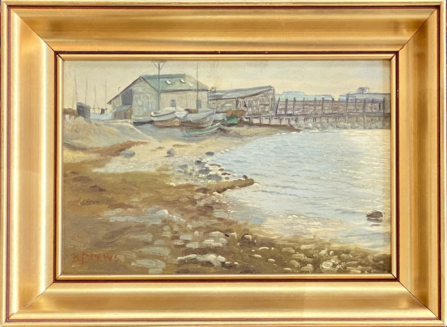 Kai Drews oliemaleri i guldramme med motiv fra Kalkbrænderihavnen.