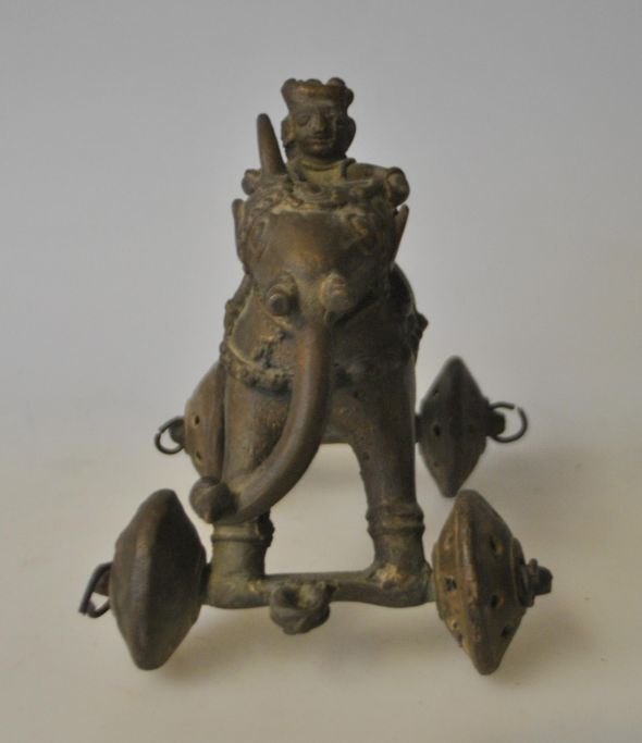 Indisk bronze elefant, 19./20. årh. Med siddende mand på ryggen. Elefant på fire hjul. H.: 11 cm. L.:13cm.