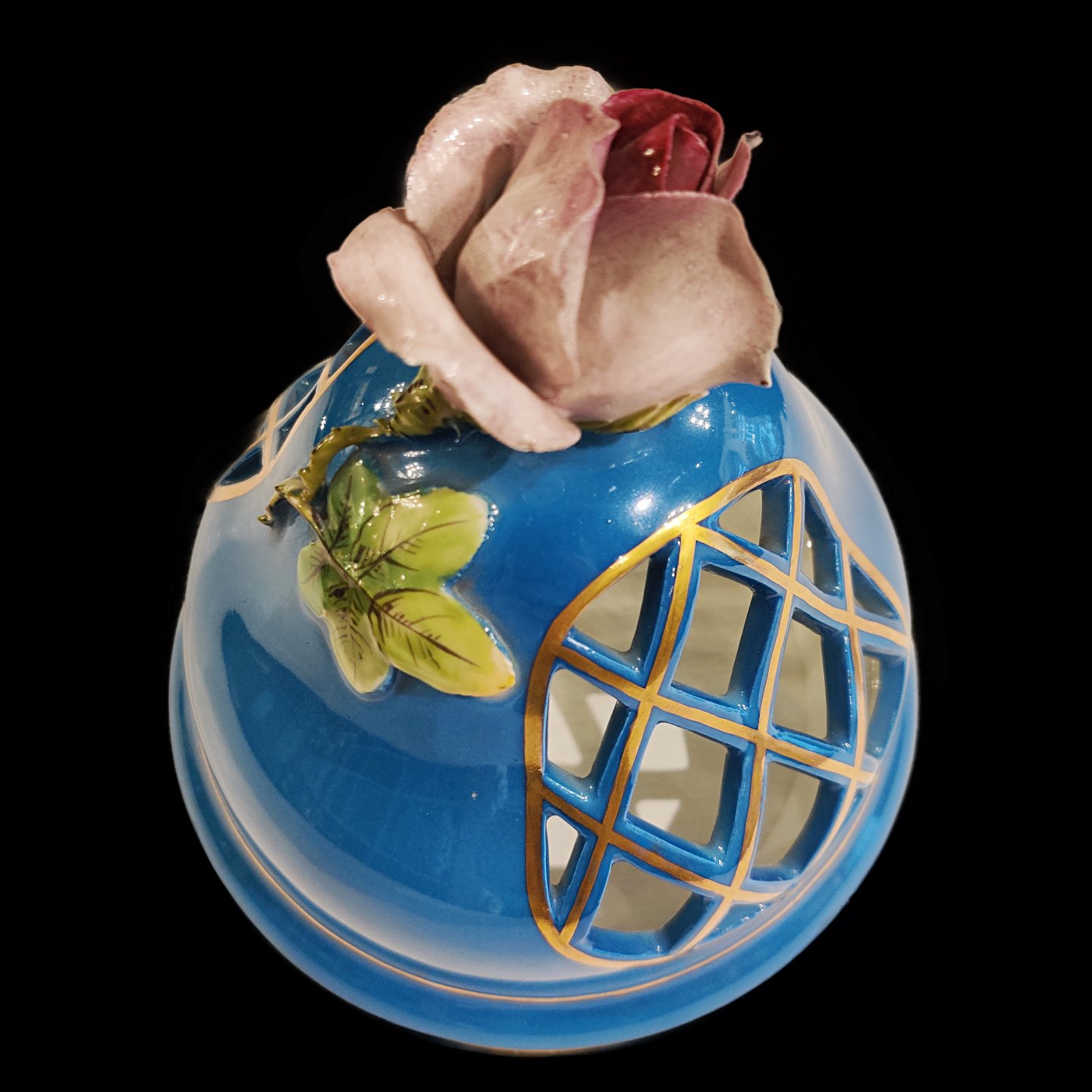Bemalet bymotiv, prydet med guld, top med pousserede rose.
