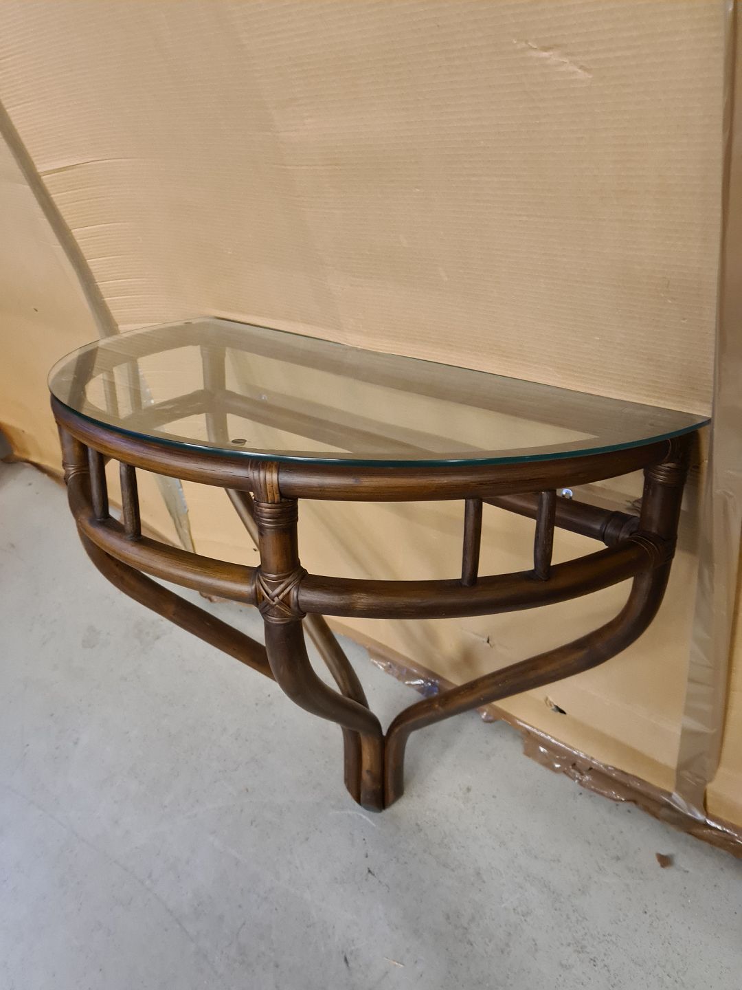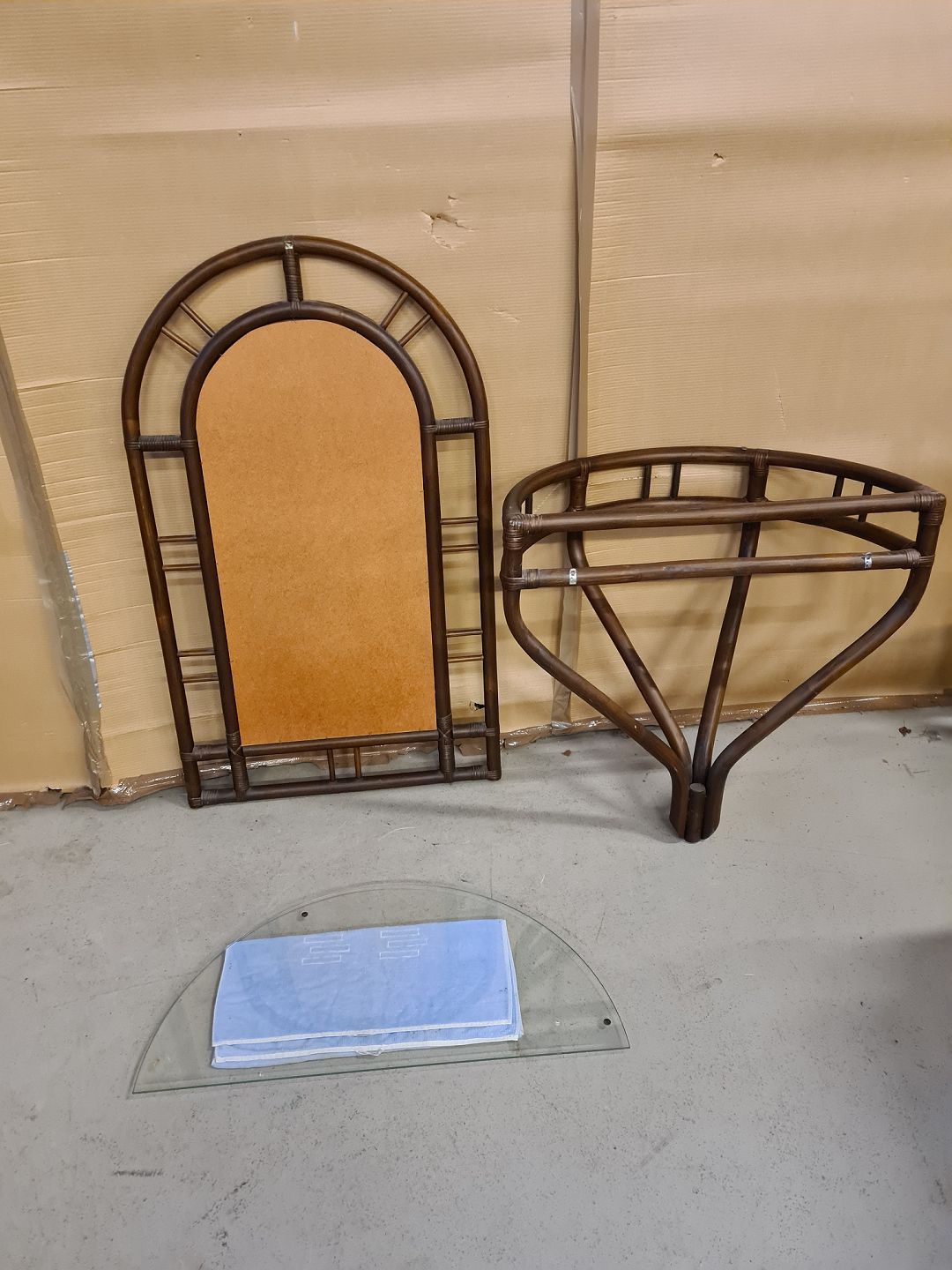 Spejl i bambus og konsol med gklasplade, fra 1990erne.