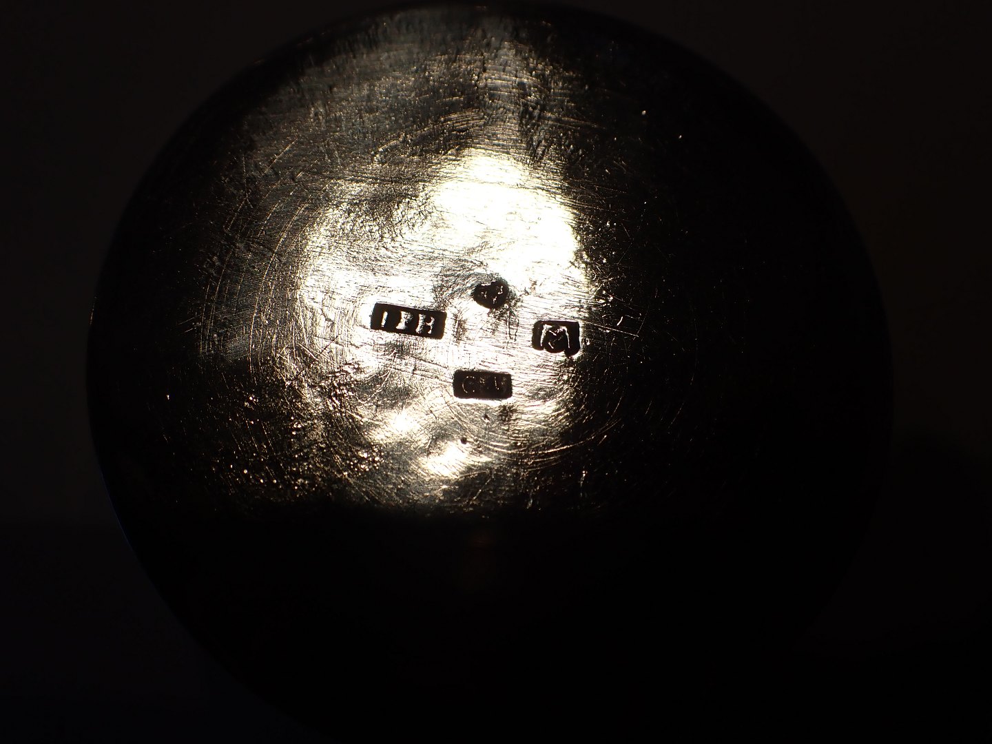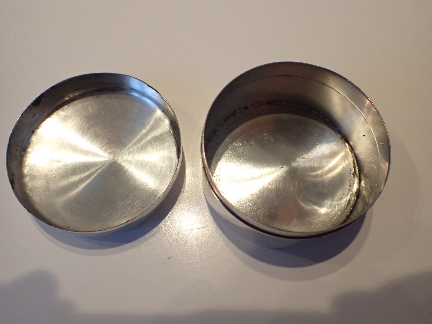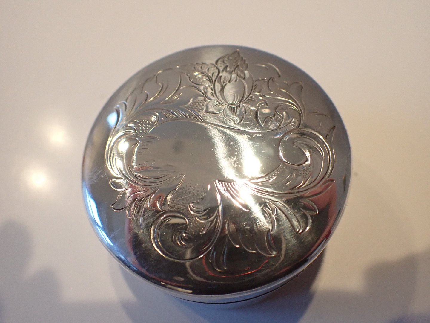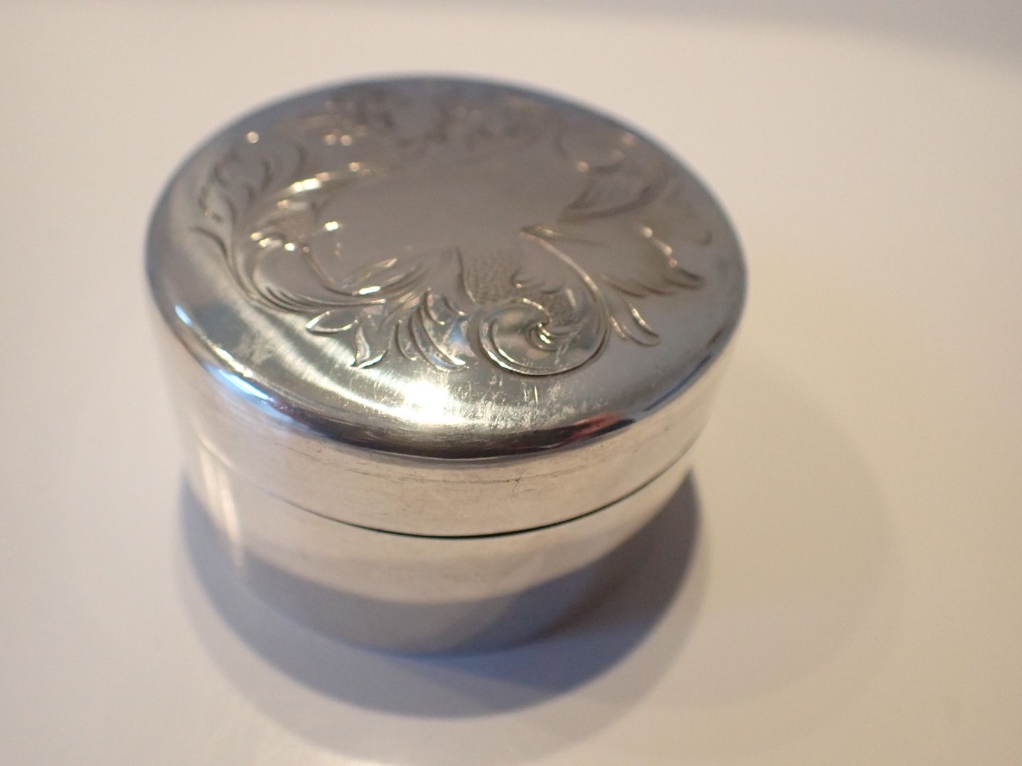 Større uhængslet rund æske i sølv med blomsterdekoraion omkring en kartouche. Svensk udført af Johan Petter Hjulström, Vesterås,årstalsmærke 1843. Vægt: gram. Diameter: 5,2 cm. Højde: 3 cm. I fin stand med tidstypisk slid.