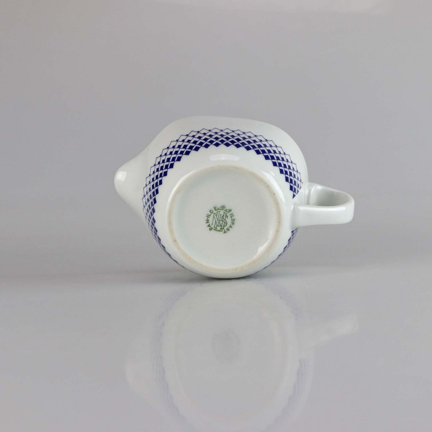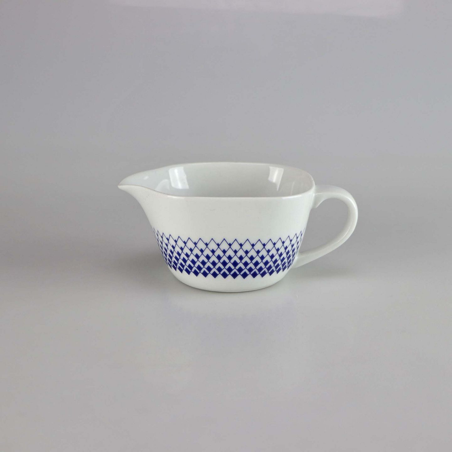 Glat hvidt porcelæn med dekoration af mørkeblå romber