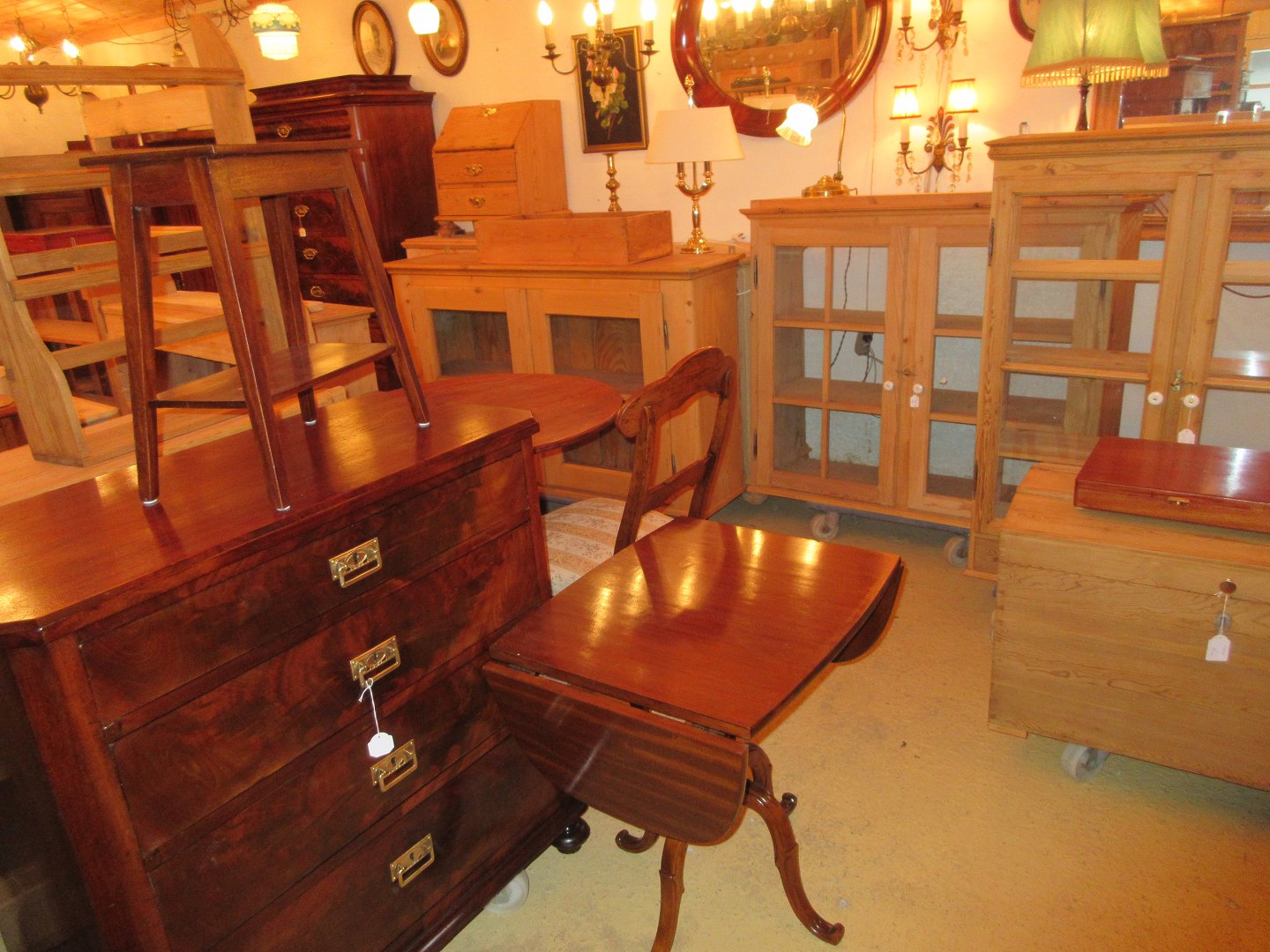 Stor salgsudstilling med restaurerede møbler håndpolerede mahognimøbler, afsyrede fyrretræsmøbler, malede træmøbler, kun originale gamle og antikke møbler.