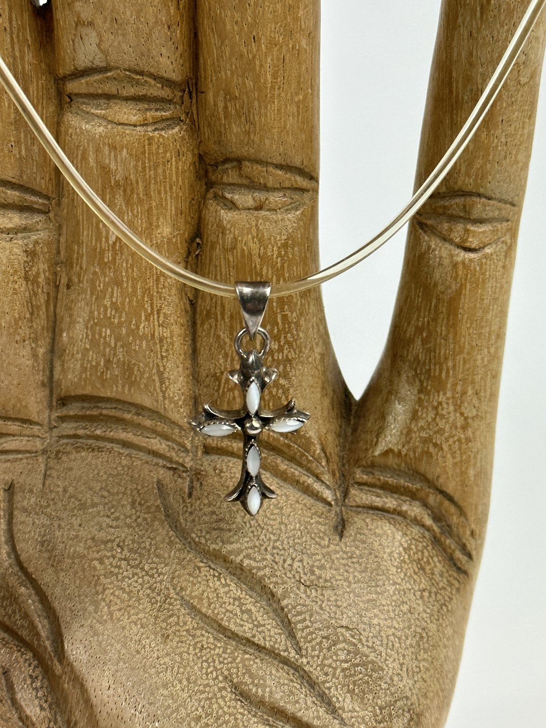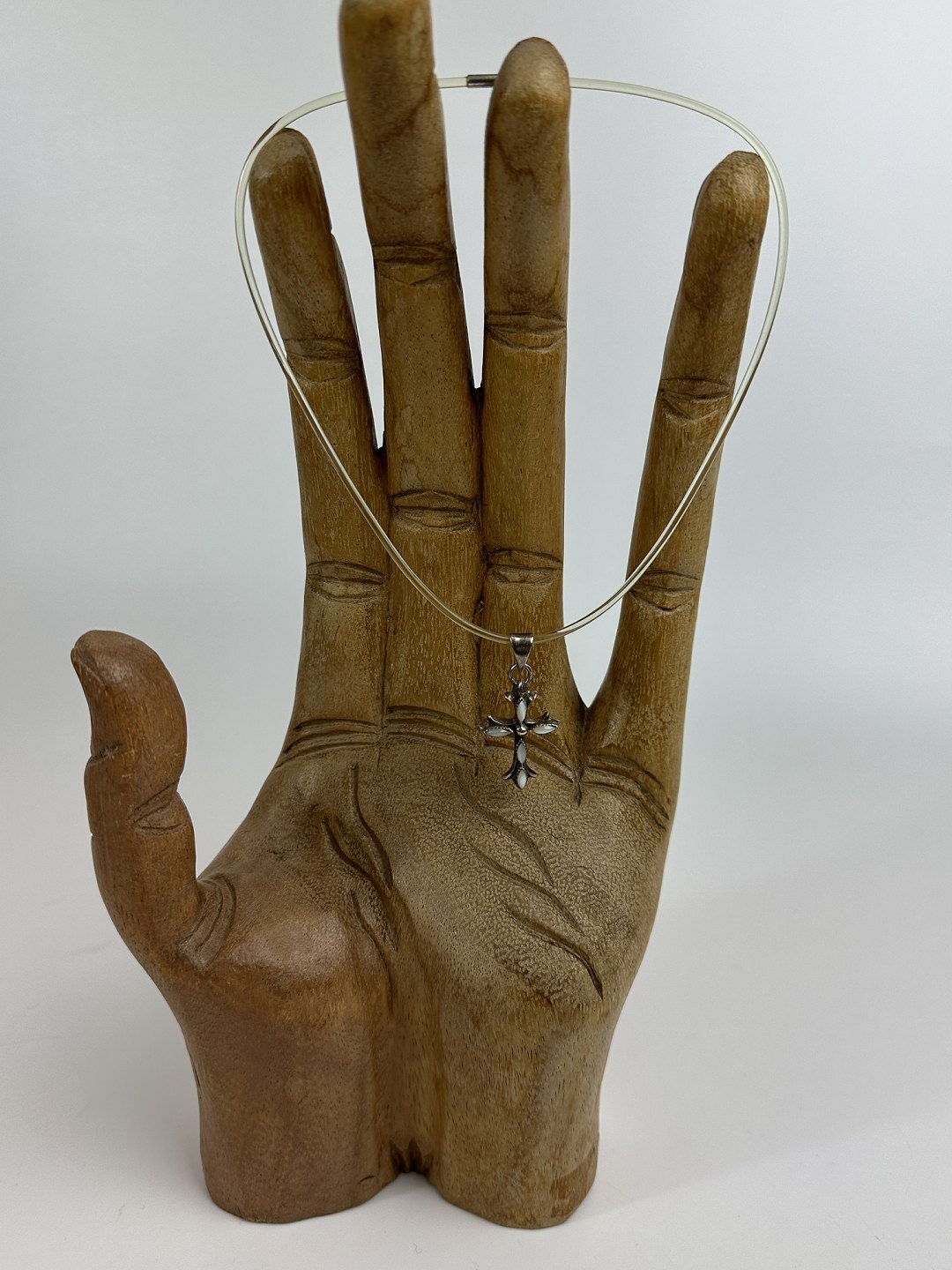 Vintage kors af sølv med gennemsigtig "kæde" af naturgummi og lås af sølv.