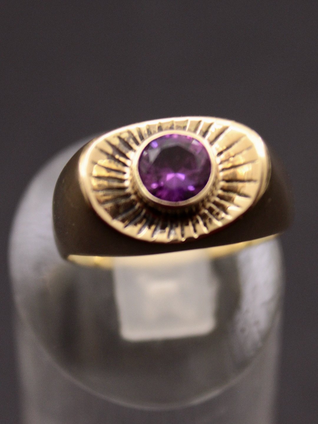 14 karat guld ring størrelse 571/2 med amatyst fra guldsmed Ibsen & Week København med logo som fugl emne nr. 529038