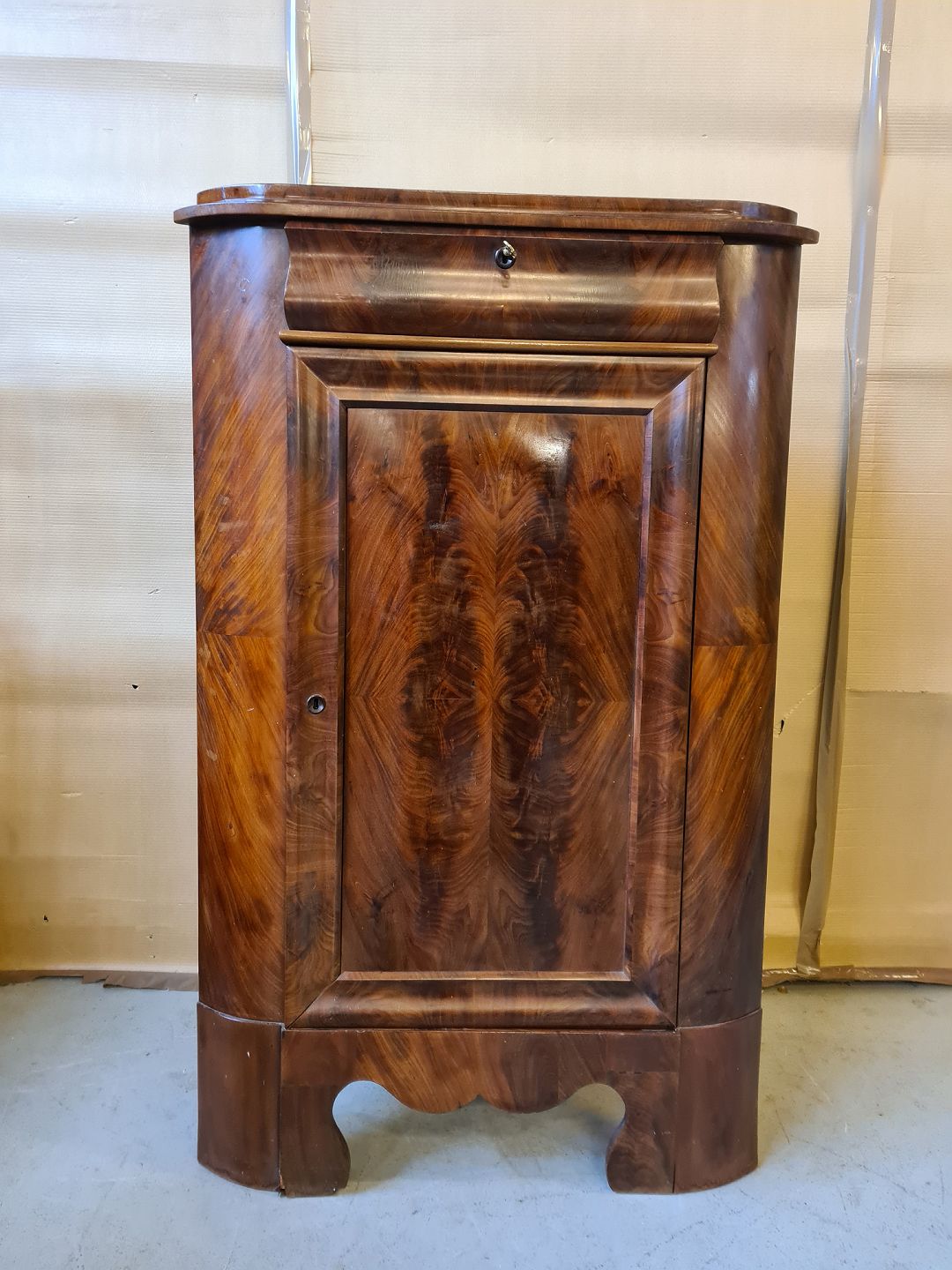Hjørneskab i fineret mahogni, fra 1890erne.