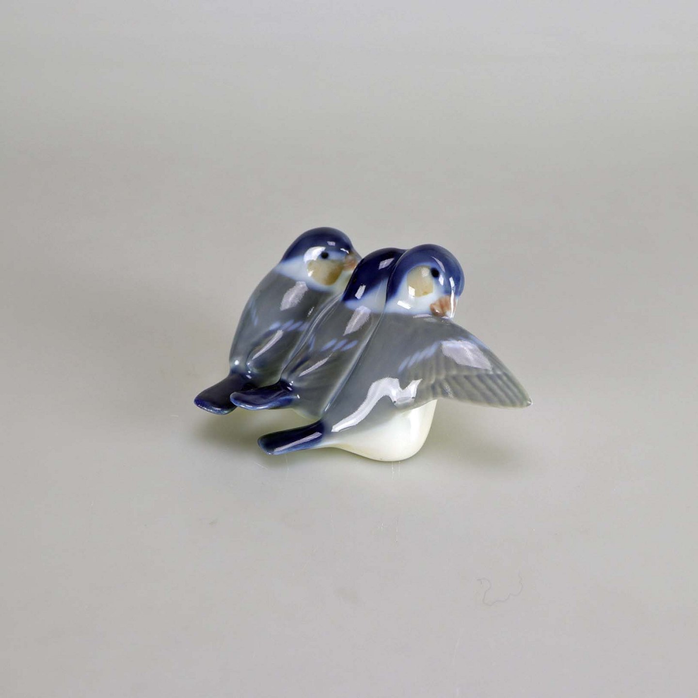 Kongelig porcelæn med tre fugle op af hinanden i blå, grå og hvide farver